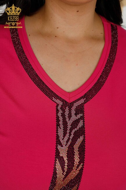 بلوزة نسائية مقلمة مطرّزة بأحجار على شكل V فوشيا - 79242 | كازي