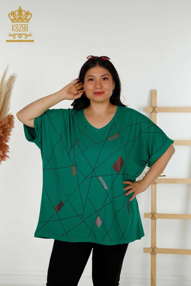 بلوزة نسائية مطرزة بأحجار القبة على شكل V أخضر - 79320 | كازي