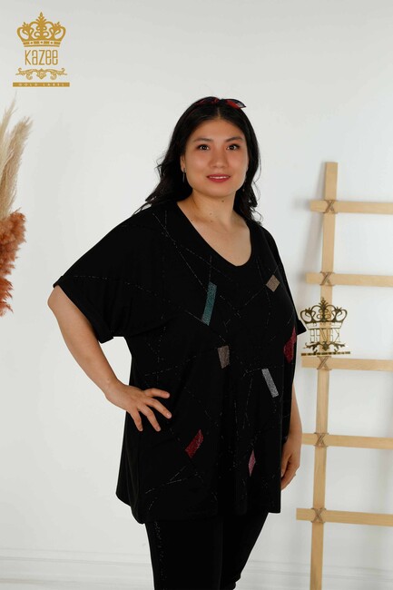 بلوزة نسائية مطرزة بأحجار القبة V أسود - 79320 | كازي