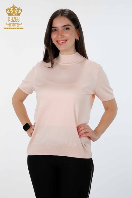 Bayan Triko Basic Dik Yaka Kısa Kol Viskon Pudra - 16168 | KAZEE