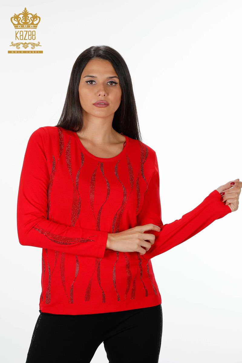 Kadın Bluz Bisiklet Yaka Kristal Taş İşlemeli Kırmızı - 79024 | KAZEE