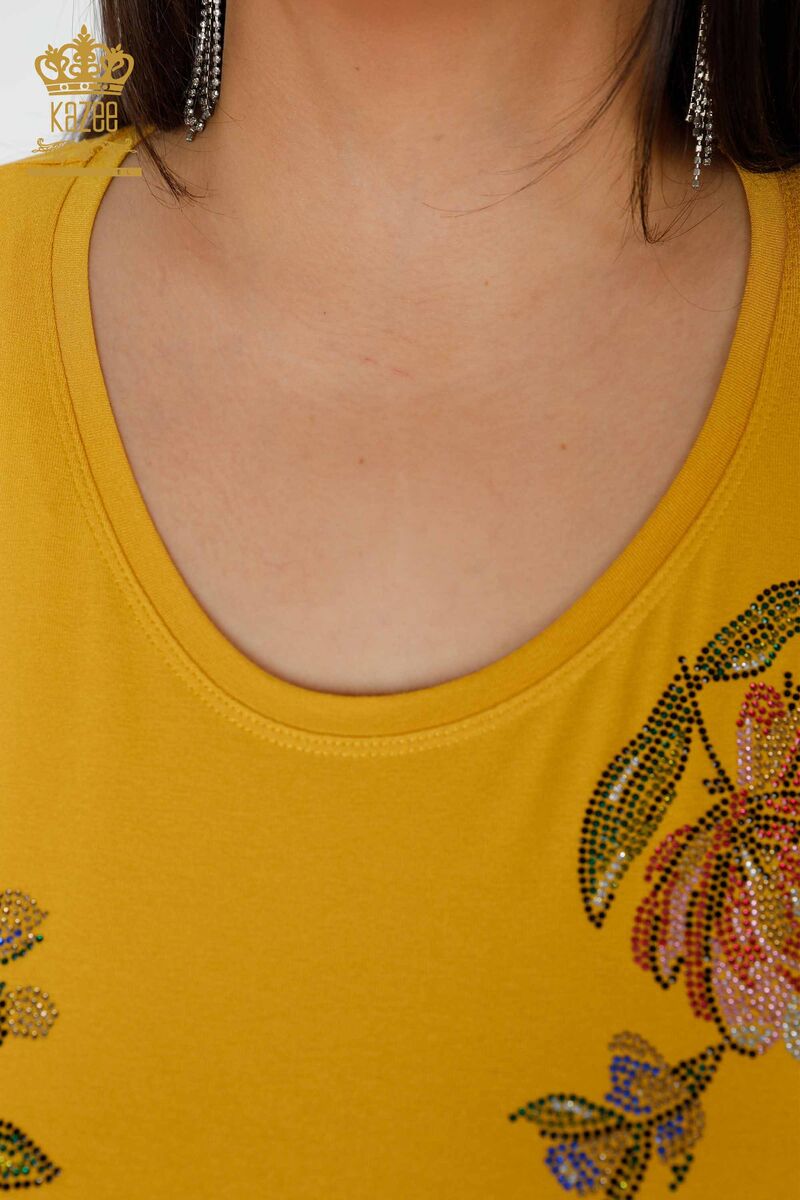 Kadın Bluz Bisiklet Yaka Taş İşlemeli Çiçek Detaylı Safran - 78937 | KAZEE