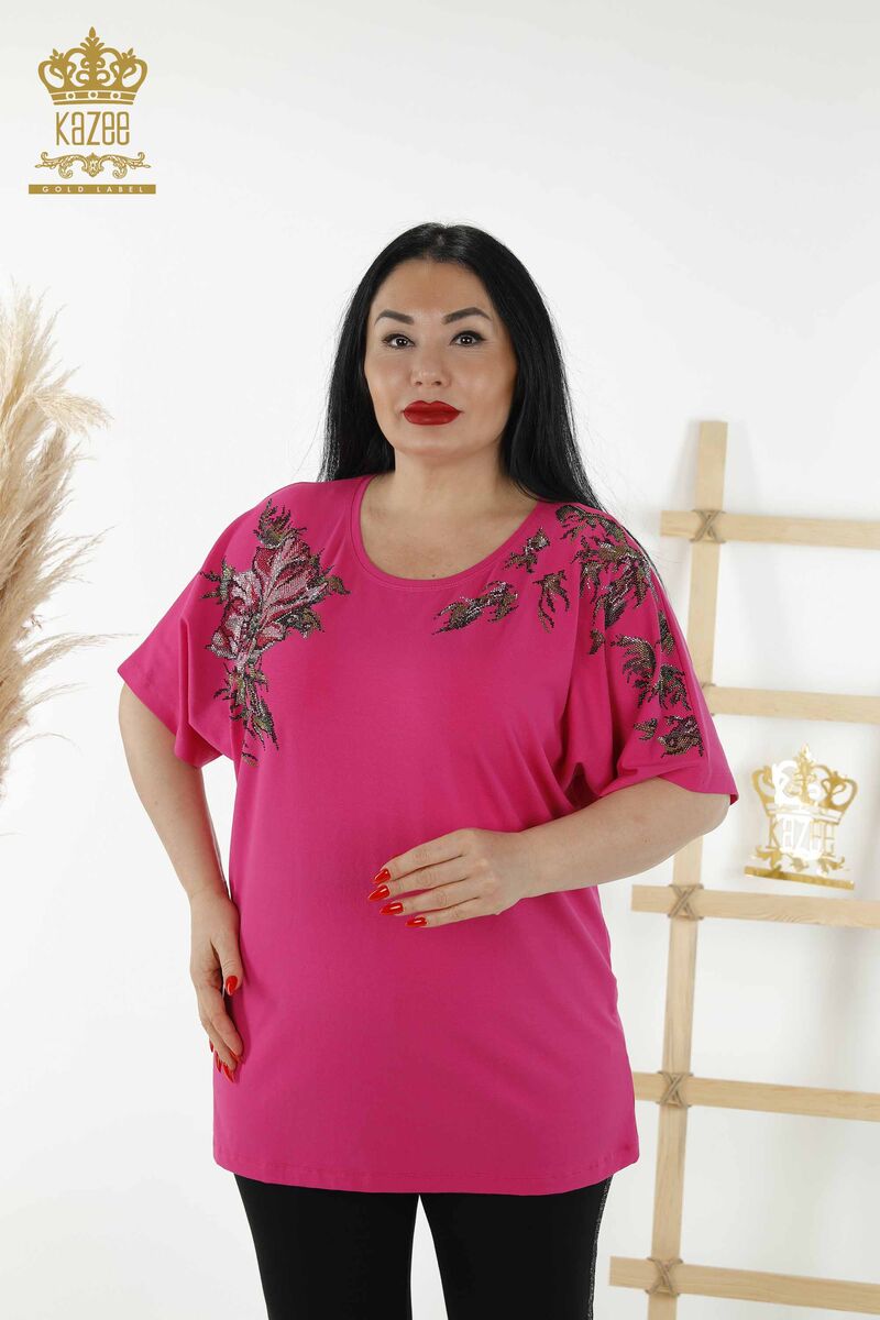 Kadın Bluz Çiçek Desenli Taş İşlemeli Bisiklet Yaka Fuşya - 79089 | KAZEE