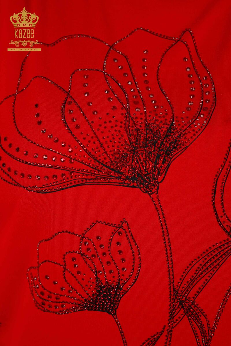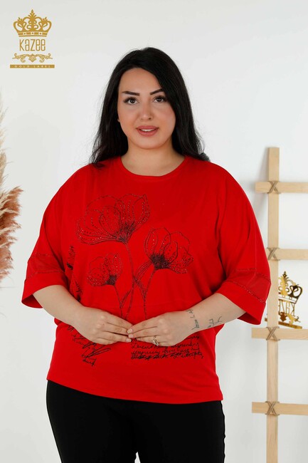 женская блузка с цветочным узором из тюля и вышитым камнем с круглым вырезом красный - 79059 | КАЗЕЕ