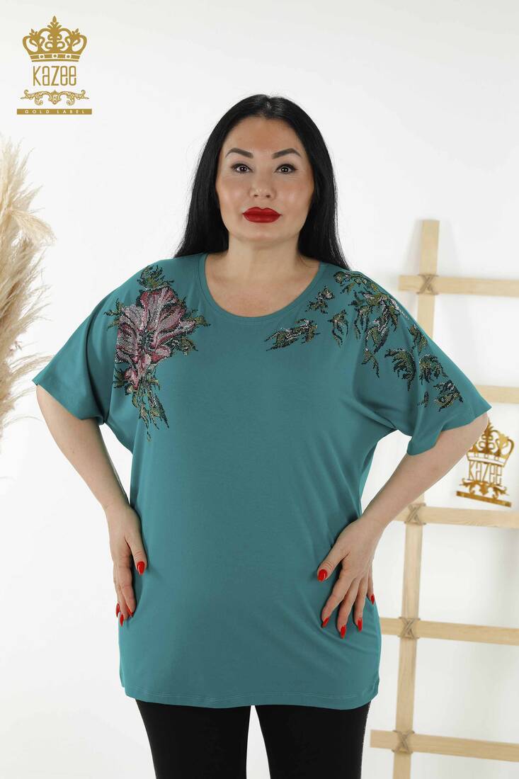 Kadın Bluz Çiçek Desenli Taş İşlemeli Bisiklet Yaka Yeşil - 79089 | KAZEE