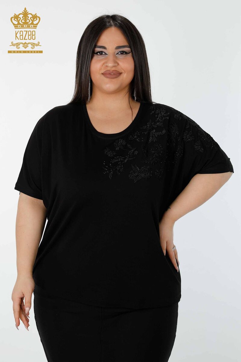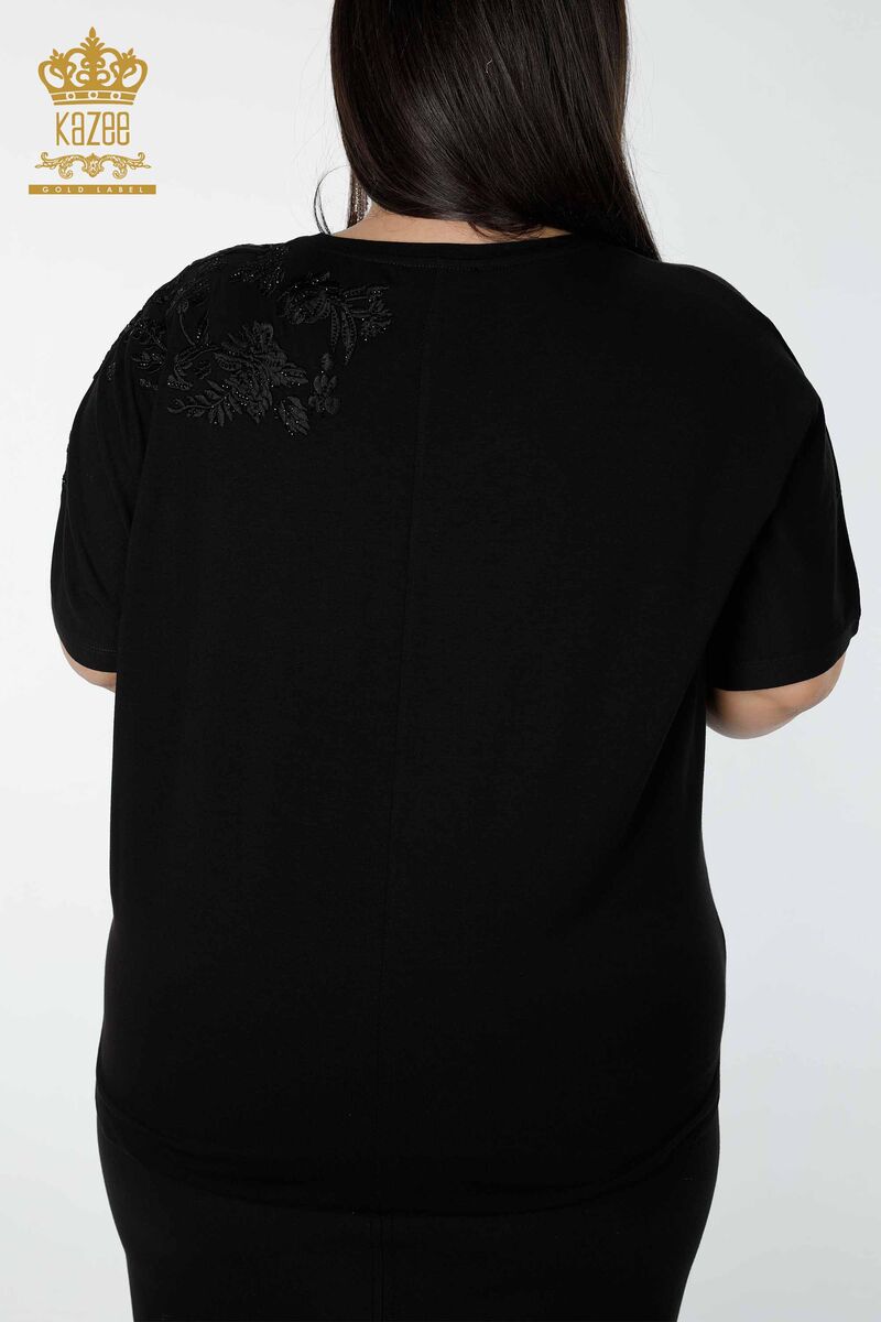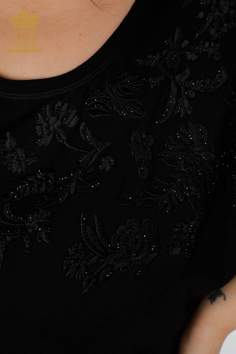 Kadın Bluz Çiçek Nakış İşlemeli Taşlı Bisiklet Yaka Siyah - 78889 | KAZEE