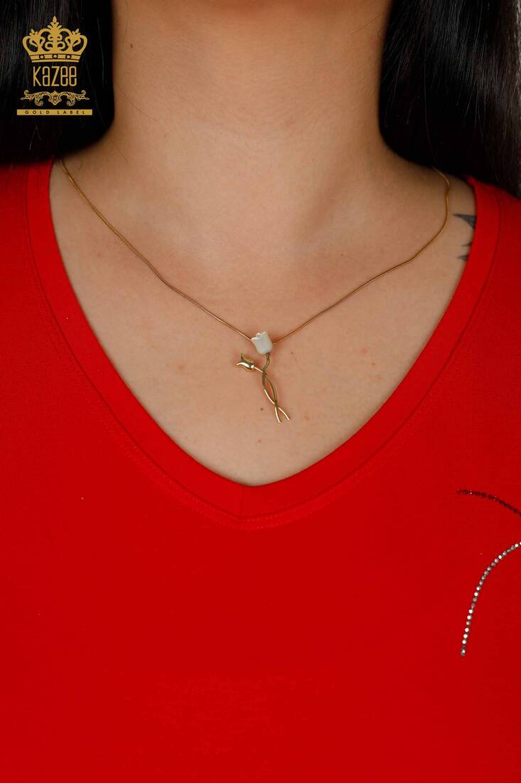 Kadın Bluz Kısa Kollu Taş İşlemeli V Yaka Kırmızı - 79318 | KAZEE