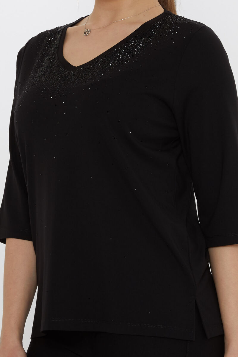 Kadın Bluz Taş Detaylı Kısa Kollu Siyah - 80034 | KAZEE
