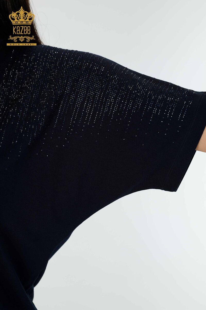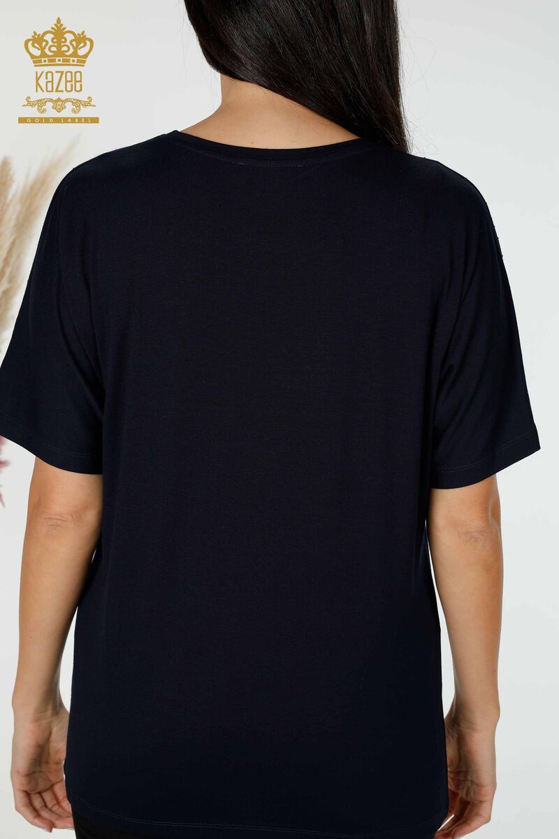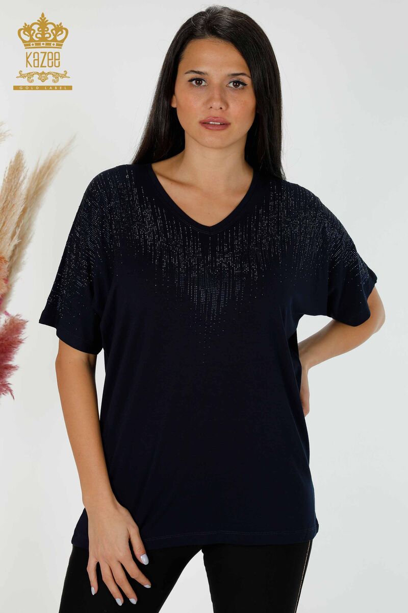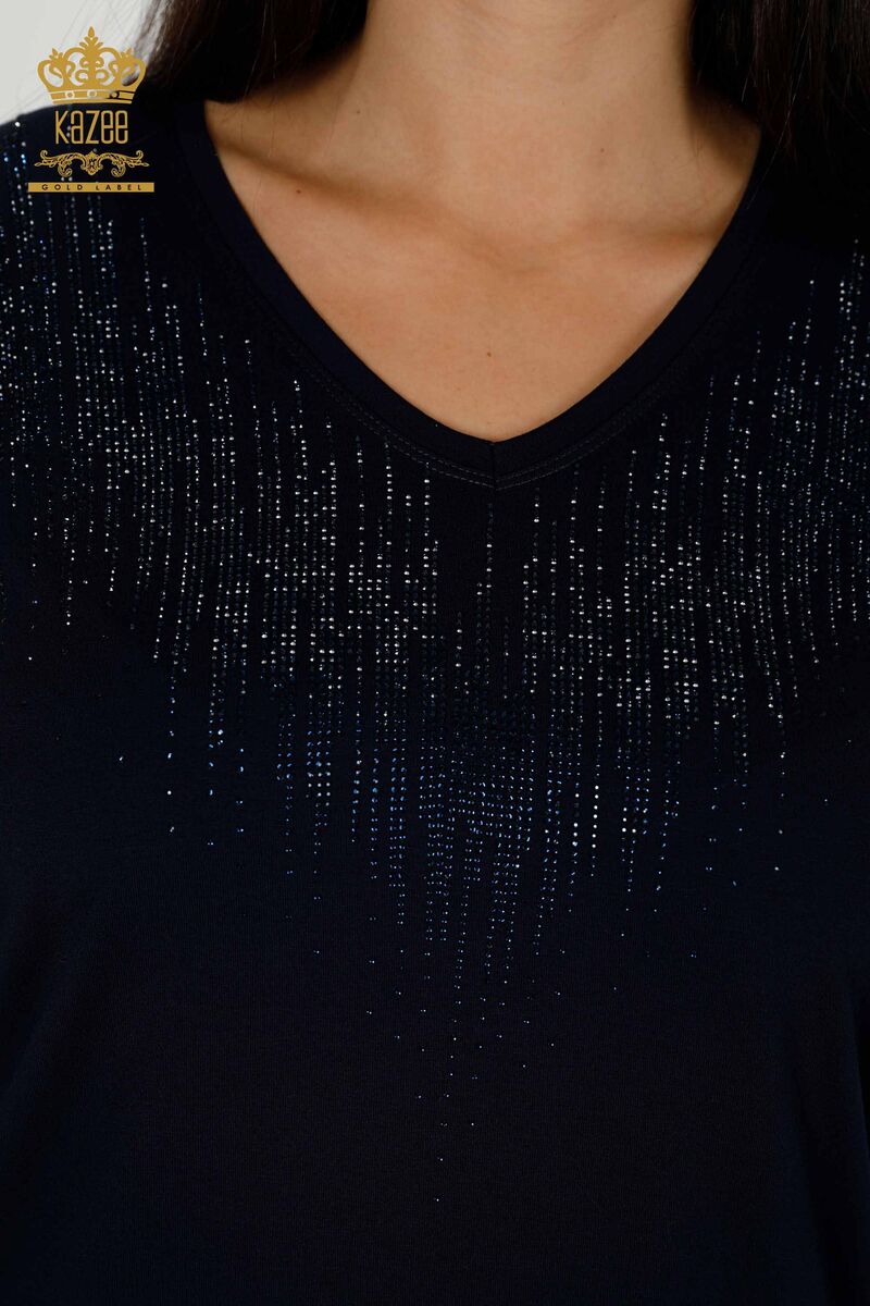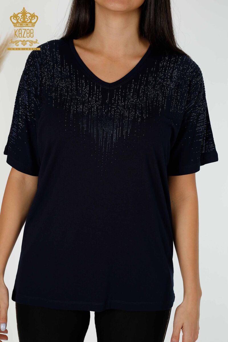 Kadın Bluz Kristal Taş İşlemeli V Yaka Lacivert - 77938 | KAZEE