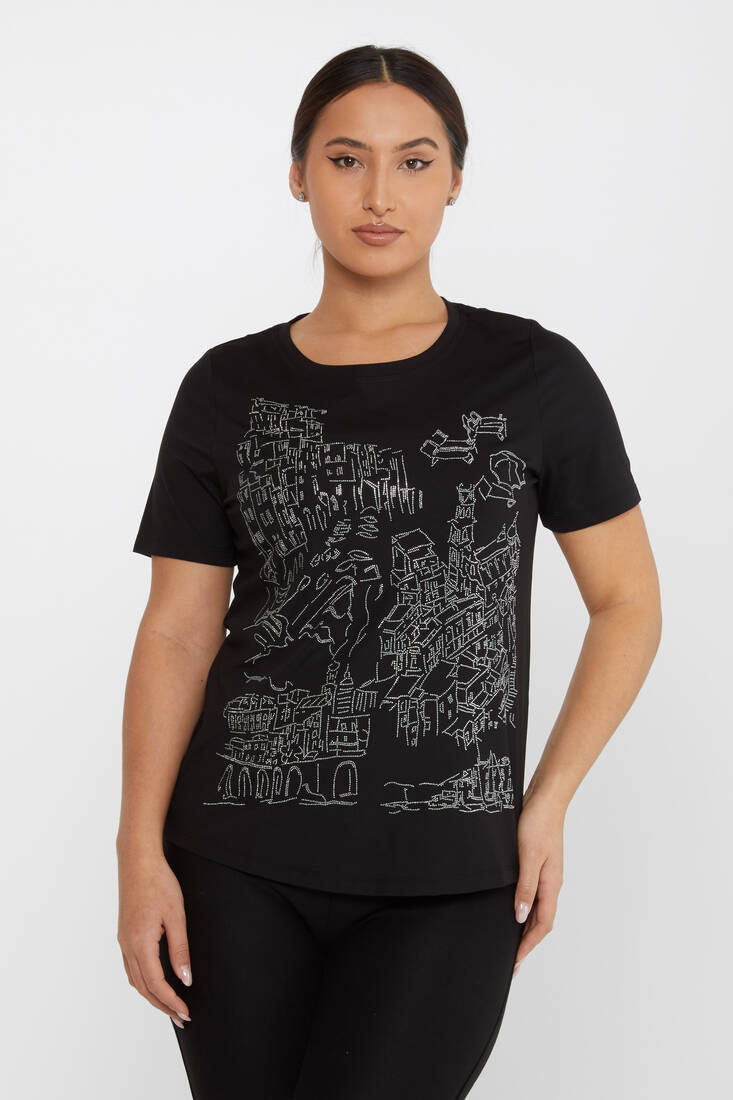Kadın Bluz Taş Detaylı Kısa Kollu Siyah - 79953 | KAZEE