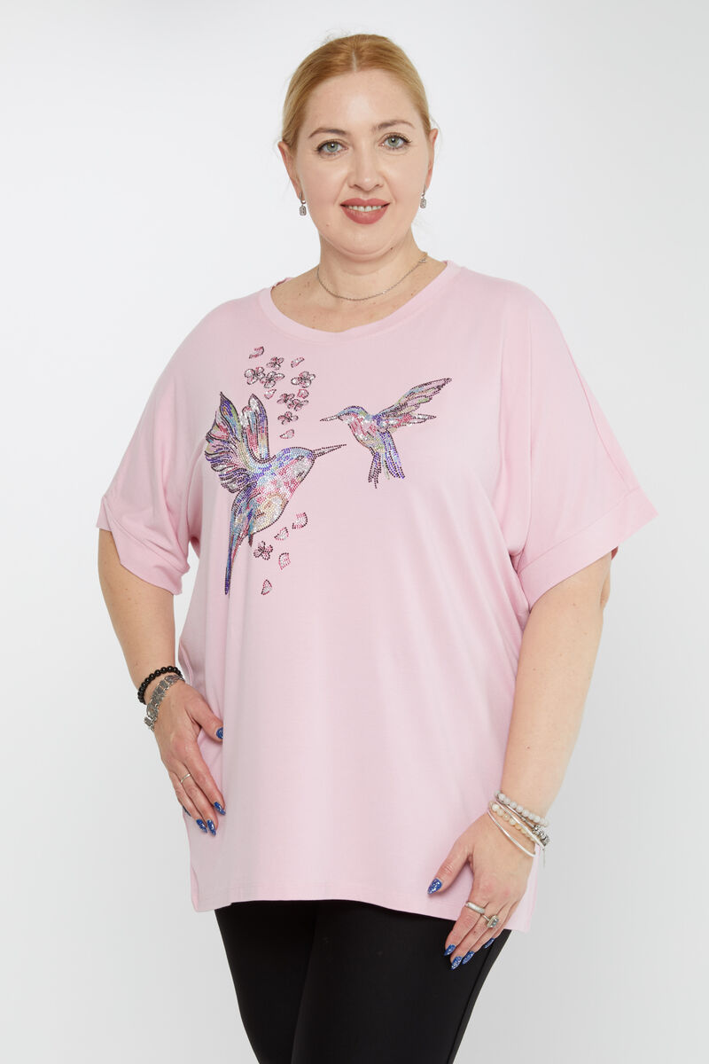 Kadın Bluz Taşlı Kuş Detaylı Bisiklet Yaka Pembe - 79948| KAZEE