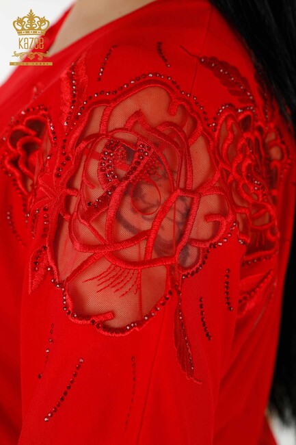 Kadın Bluz Tül Detaylı Taş İşlemeli Bisiklet Yaka Kırmızı - 79142 | KAZEE