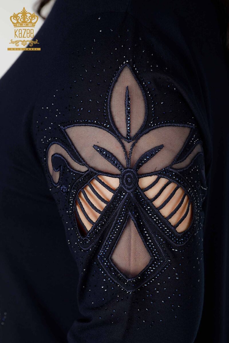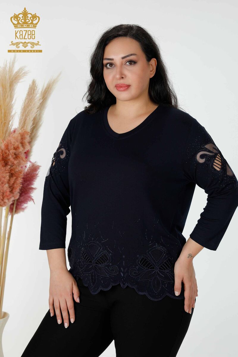 Kadın Bluz Tül Detaylı Taş İşlemeli V Yaka Lacivert - 77927 | KAZEE