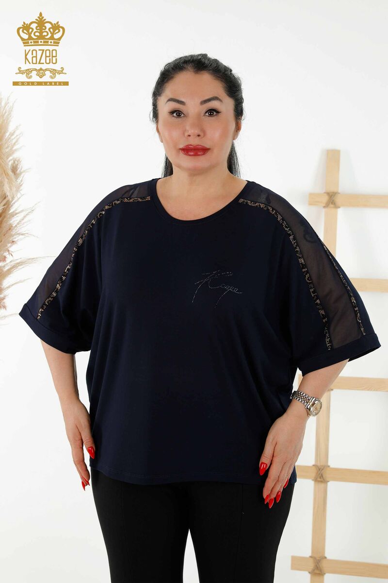Kadın Bluz Tül Detaylı Taş İşlemeli Kazee Yazılı Bisiklet Yaka Lacivert - 79098 | KAZEE