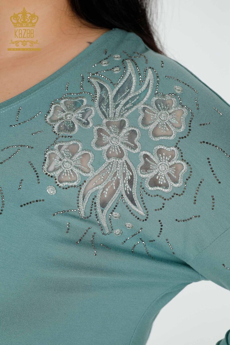 Kadın Bluz Tül Detaylı Çiçek Nakışlı Taşlı Bisiklet Yaka Mint - 77950 | KAZEE