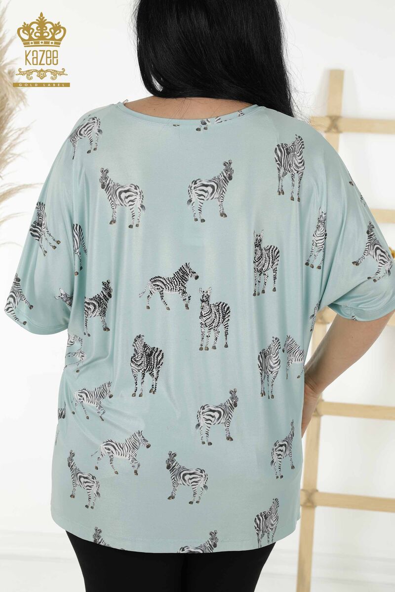 Kadın Bluz Zebra Desenli Taş İşlemeli Bisiklet Yaka Mint - 77690 | KAZEE