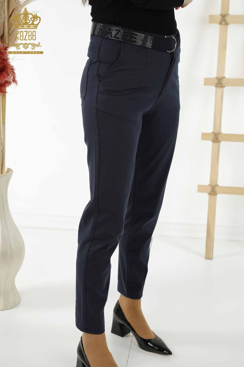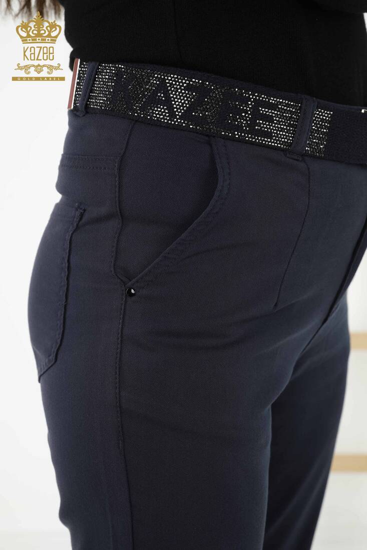 Kadın Pantolon Kemer Detaylı Kazee Yazılı Taş İşlemeli Cepli Lacivert - 3685 | KAZEE