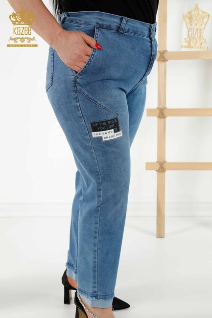Kadın Pantolon Yazı Detaylı Taş İşlemeli Cepli Mavi - 3677 | KAZEE