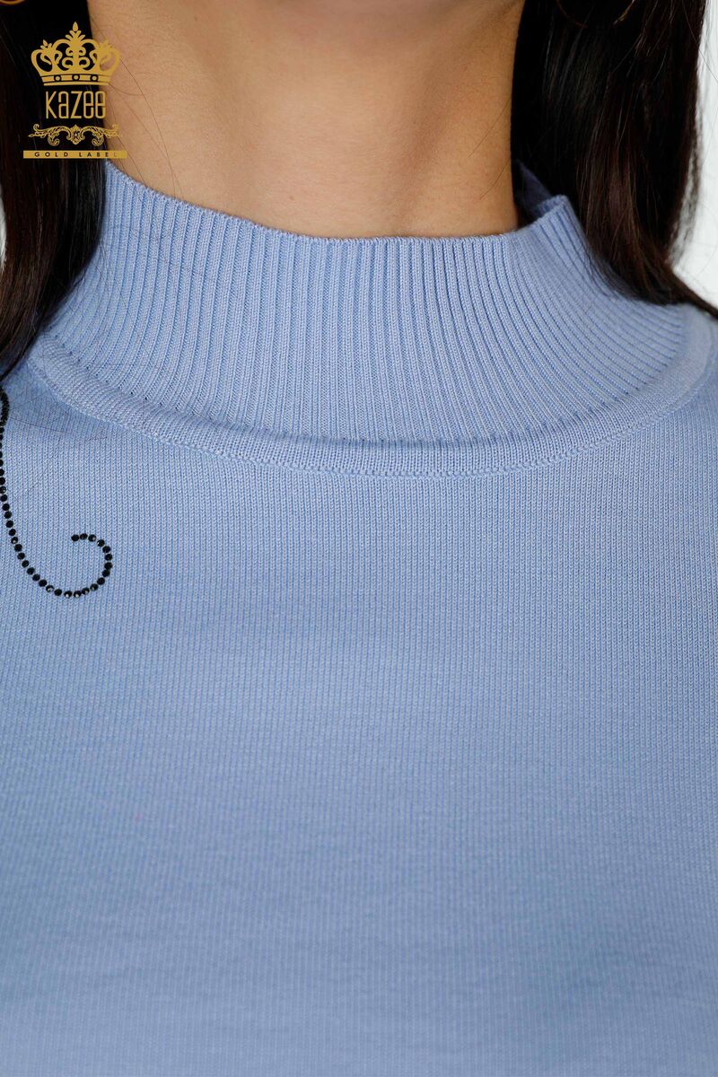 Kadın Triko Çiçek Desenli Taş İşlemeli Dik Yaka Mavi - 16597 | KAZEE
