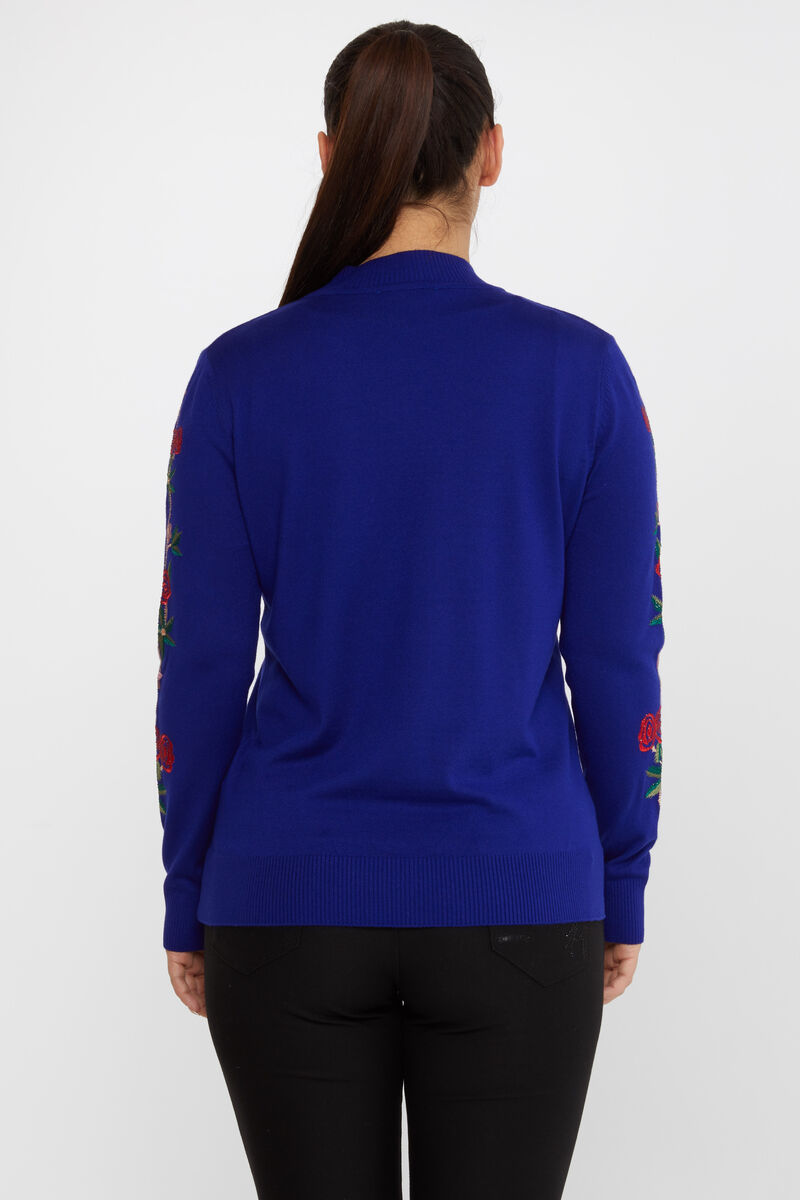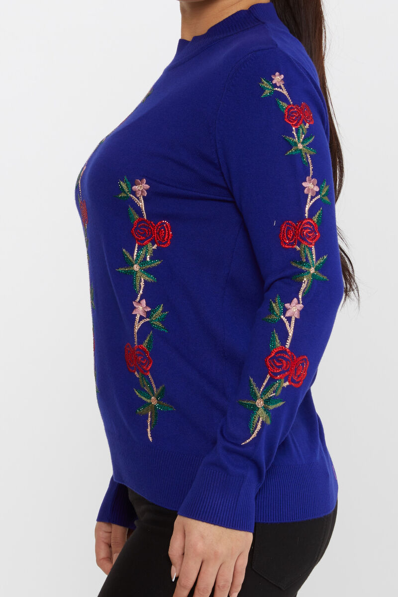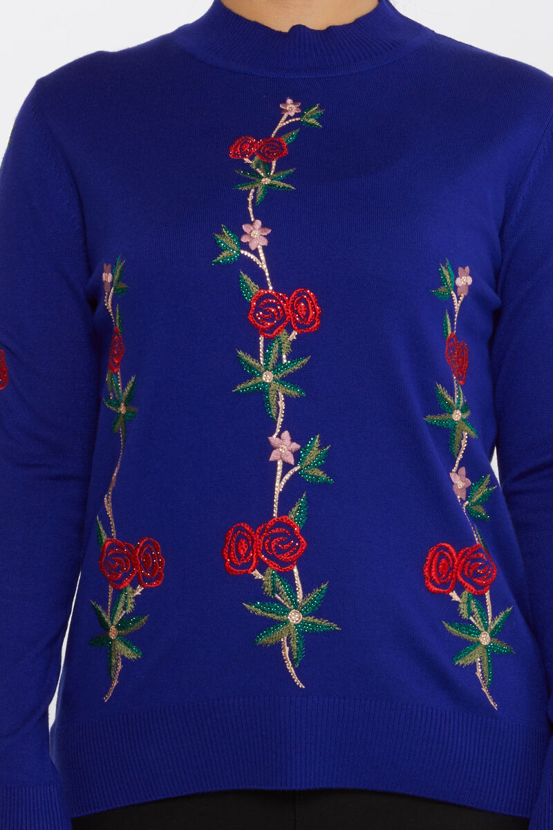 Kadın Triko Çiçek Desenli Uzun Kollu Nakışlı Saks - 16285 | KAZEE