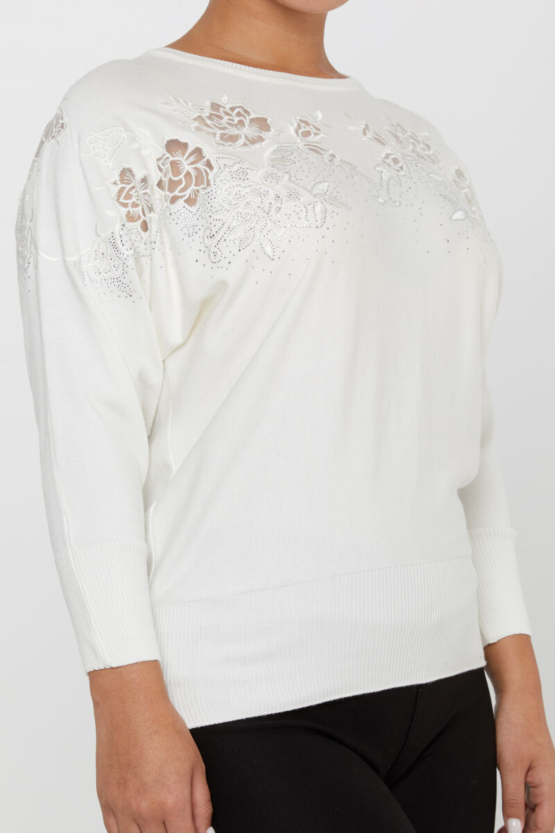 Kadın Triko Çiçek Nakışlı Taş İşlemeli Ekru - 30925 | KAZEE