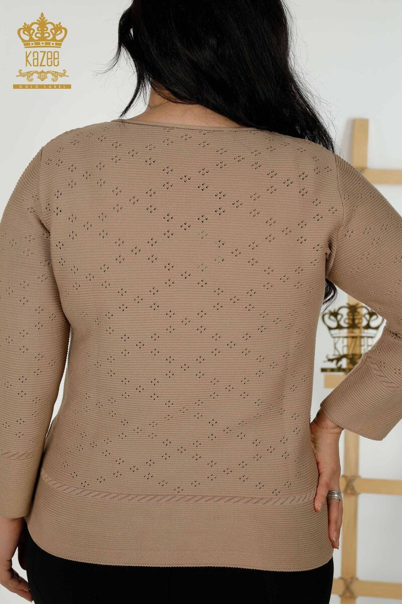 Kadın Triko Desenli Uzun Kollu Basic Bisiklet Yaka Koyu Bej - 30083 | KAZEE