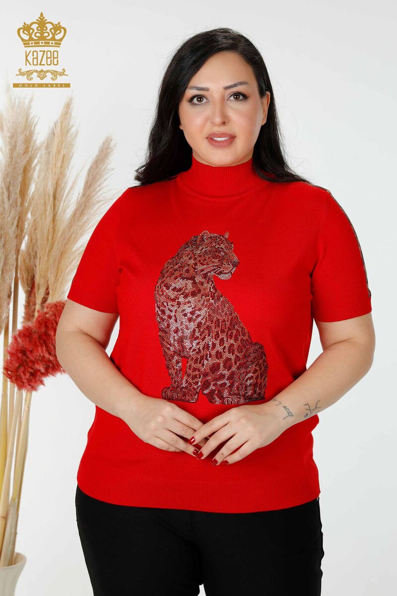 Kadın Triko Kaplan Desenli Taş İşlemeli Dik Yaka Kırmızı - 16999 | KAZEE