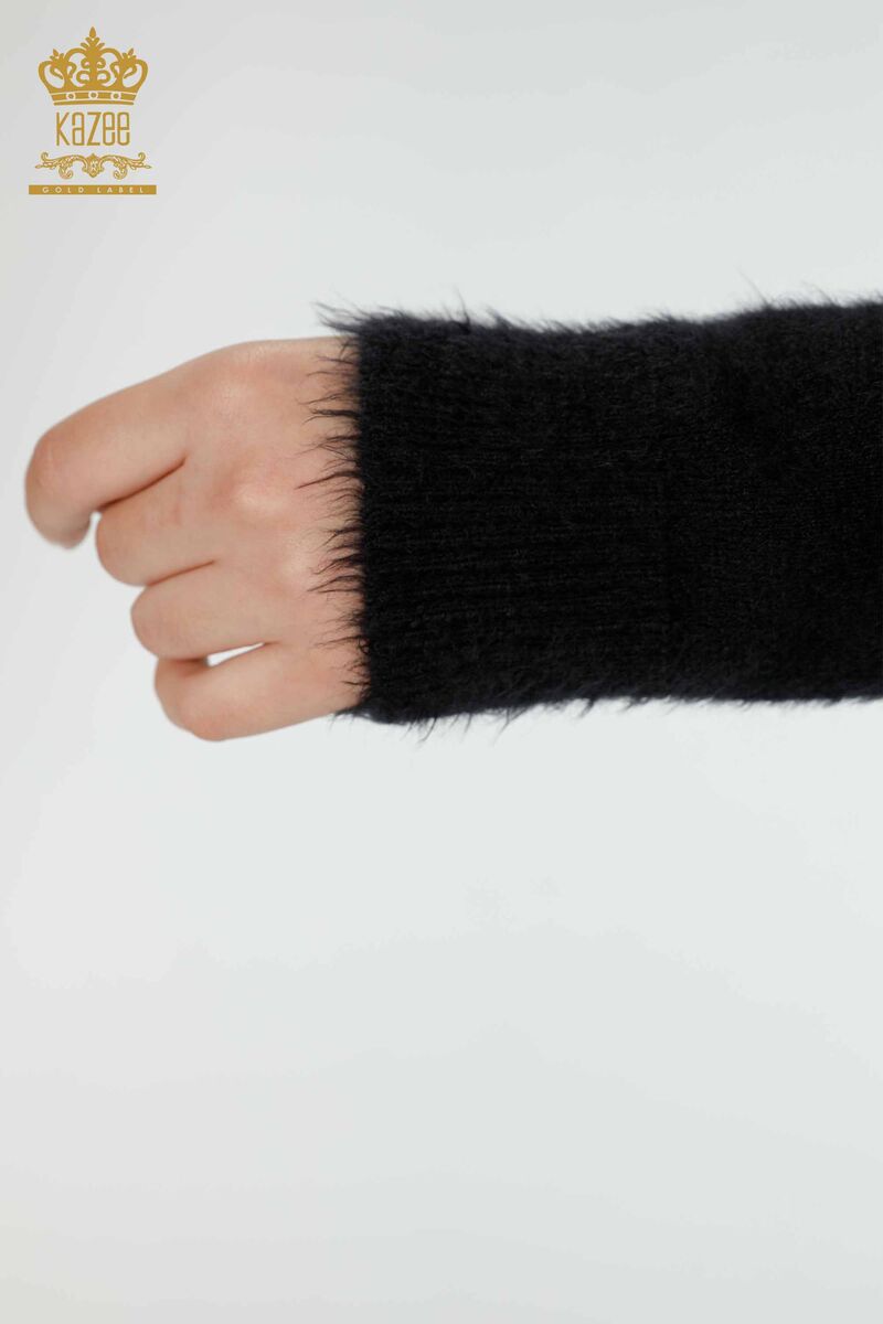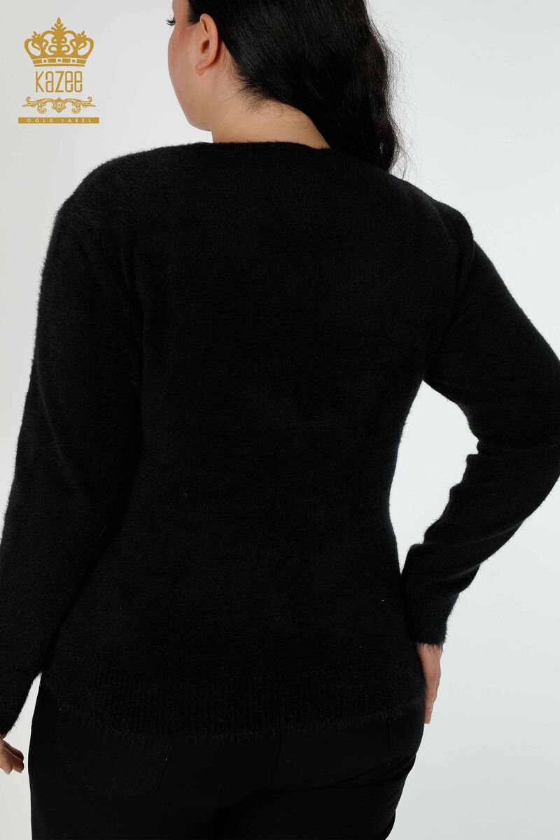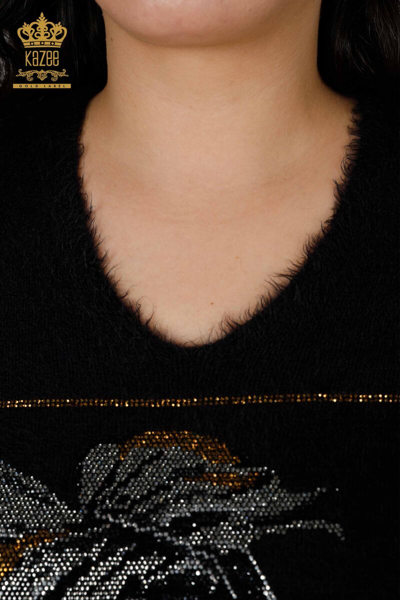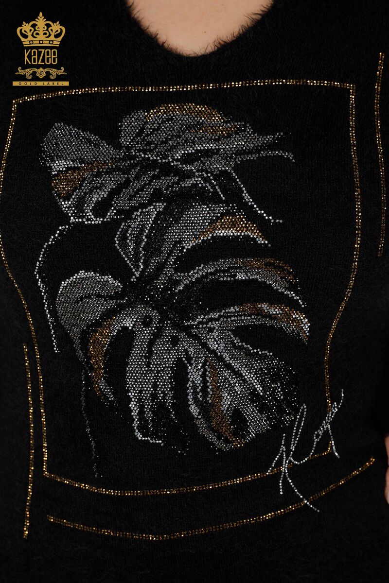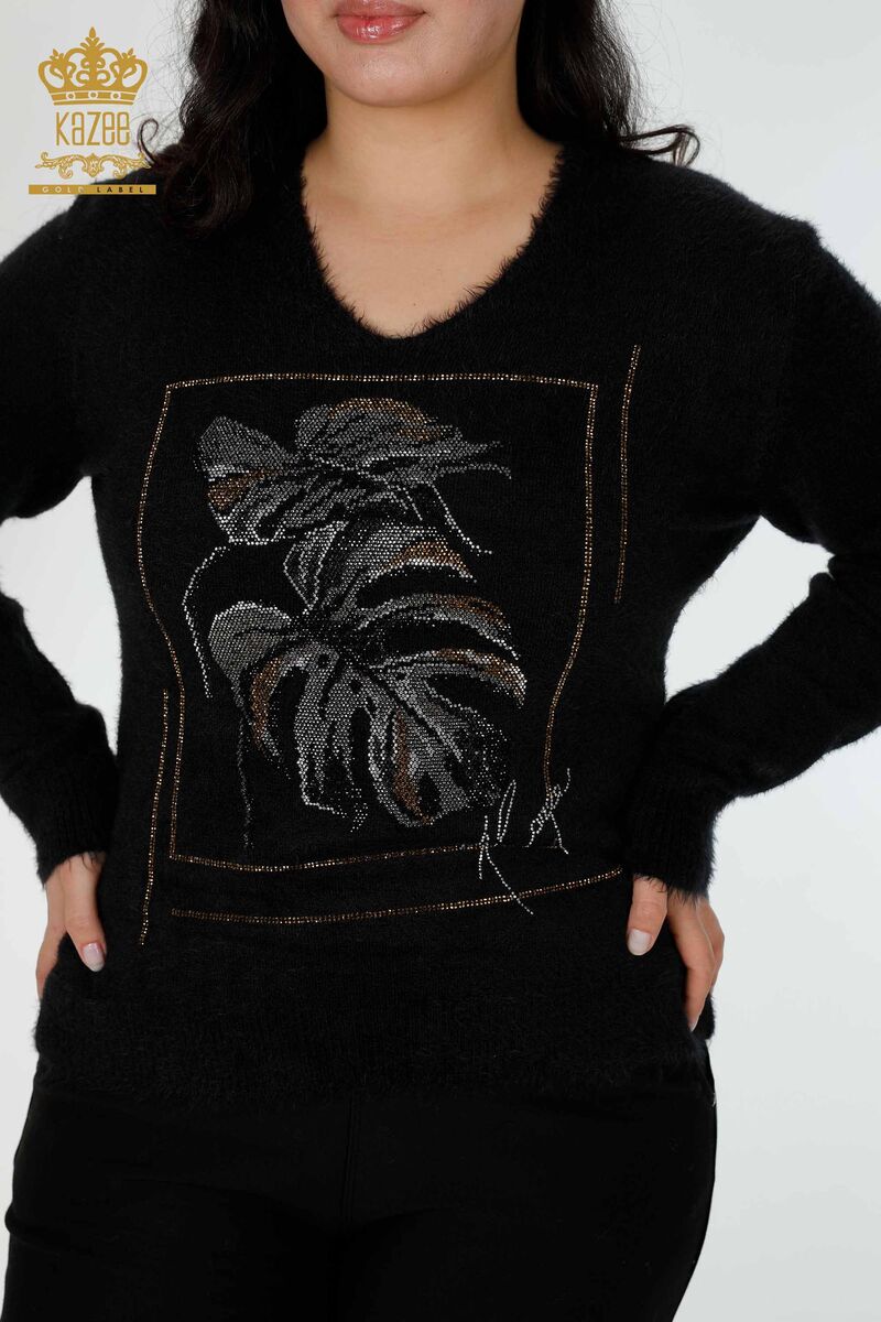 Kadın Triko Kazak Yaprak Desenli Angora Taş İşlemeli Bisiklet Yaka Siyah - 16995 | KAZEE