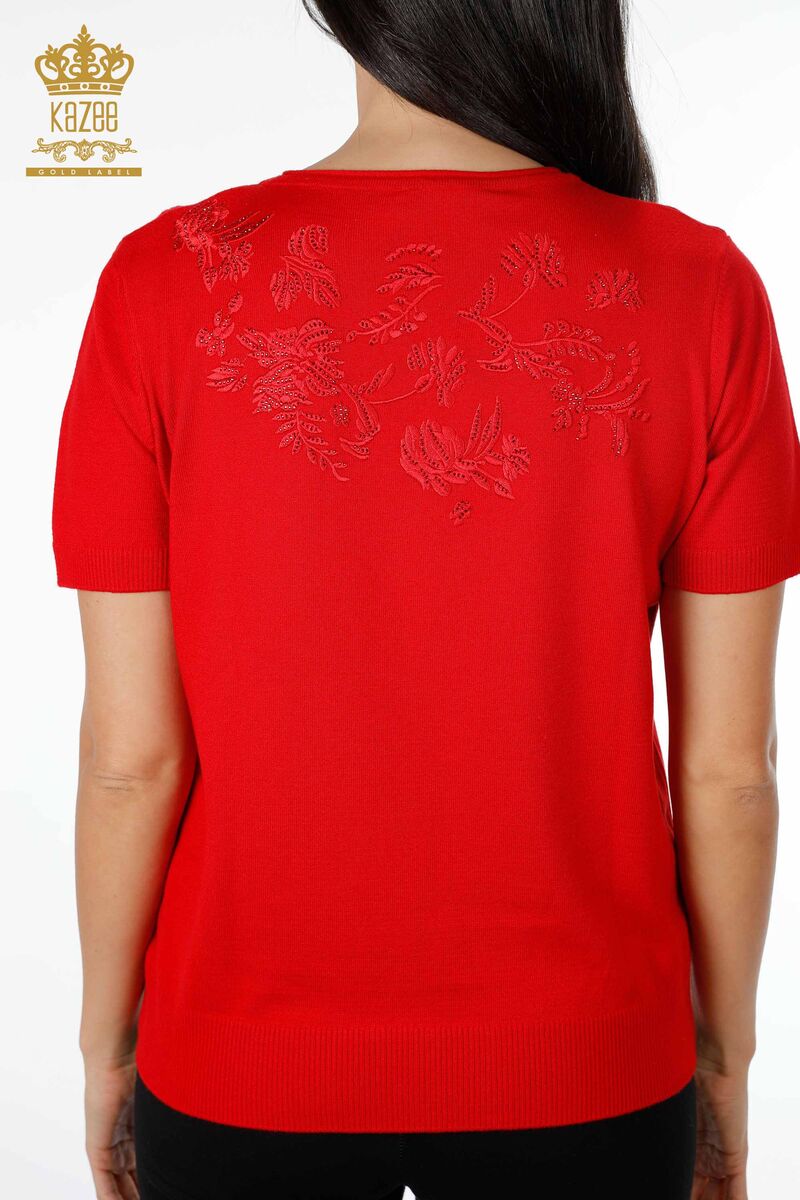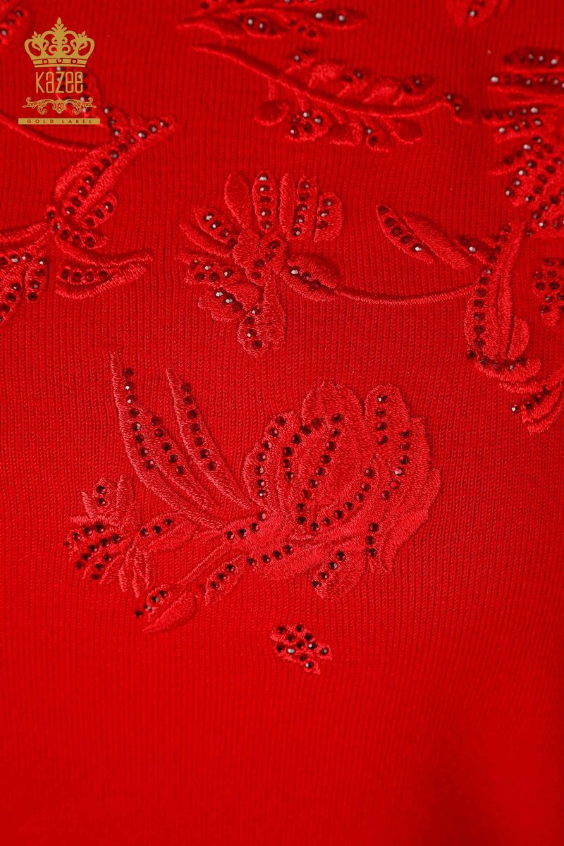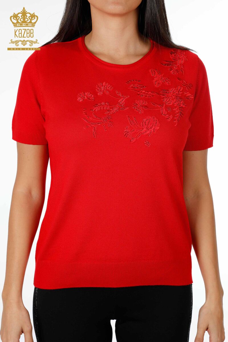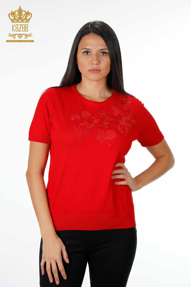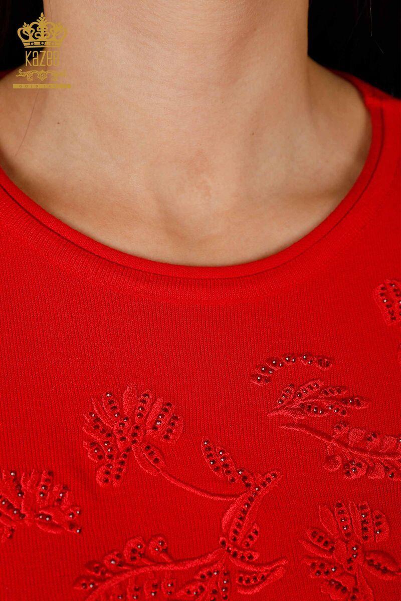 Kadın Triko Bisiklet Yaka Taş Nakış İşlemeli Kırmızı - 16849 | Kazee