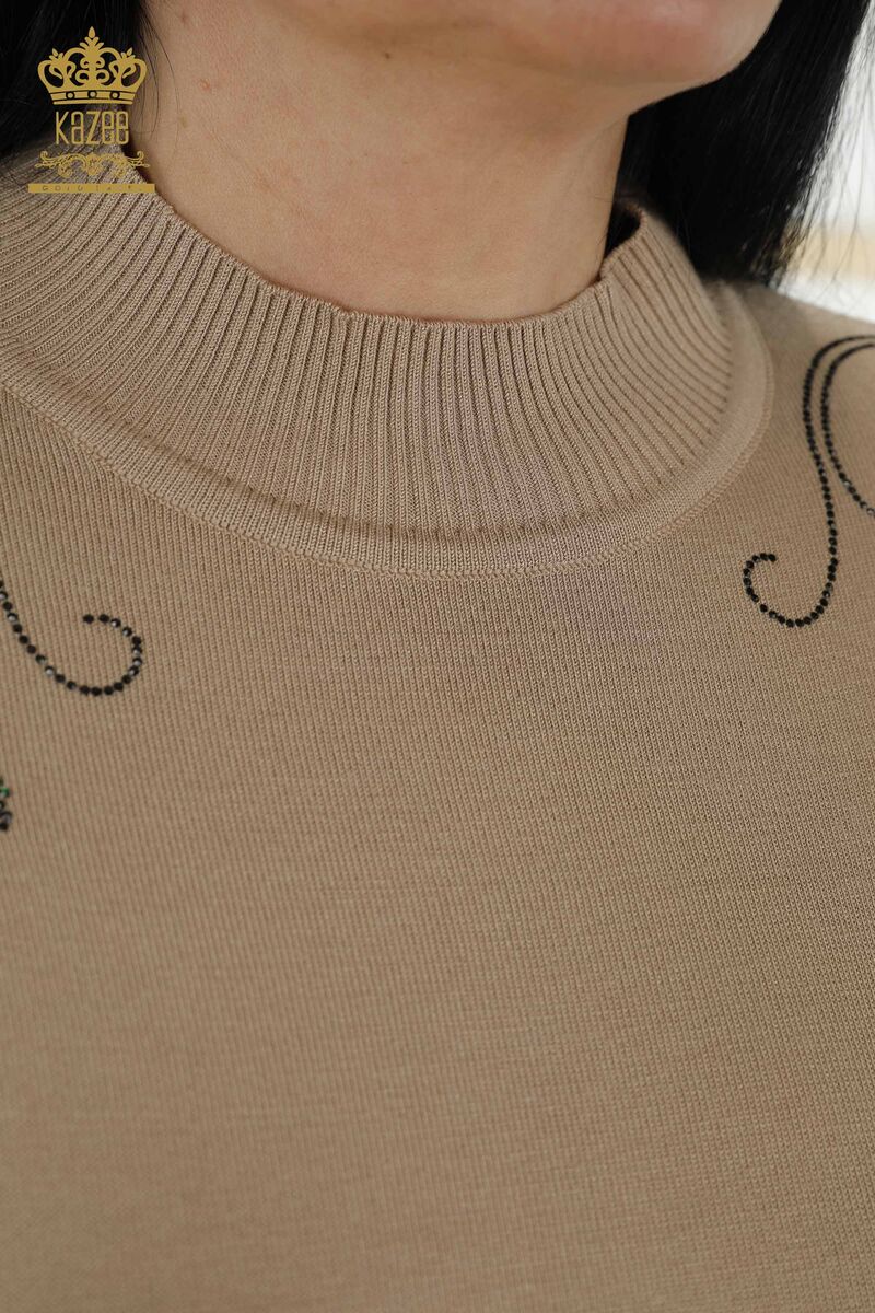 Kadın Triko Renkli Taş İşlemeli Çiçek Desenli Dik Yaka Bej - 30007 | KAZEE