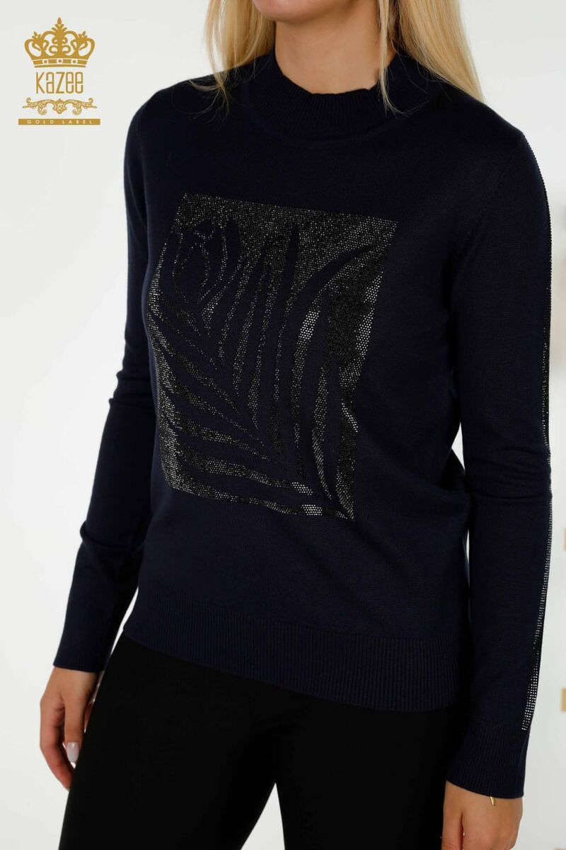 Kadın Triko Taş Detaylı Dik Yaka Lacivert - 30448 | KAZEE