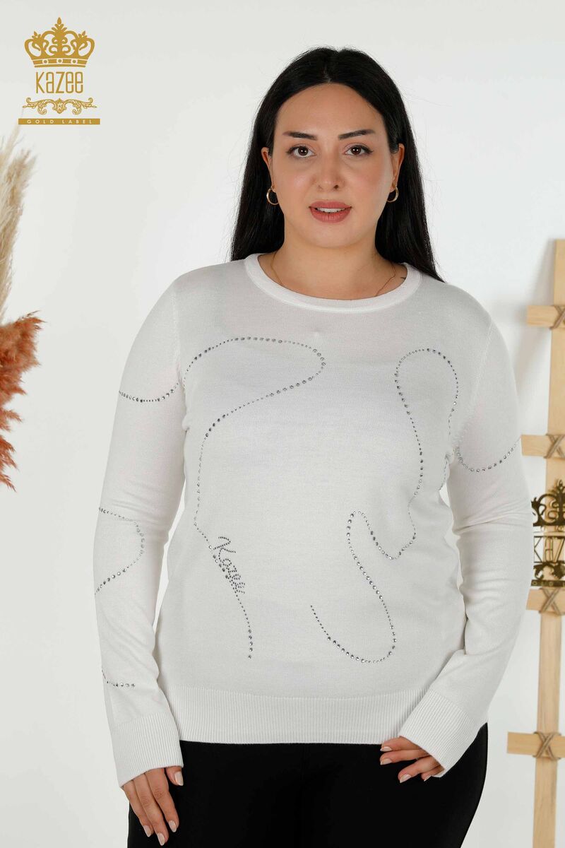 Kadın Triko Taş İşlemeli Bisiklet Yaka Ekru - 30157 | KAZEE
