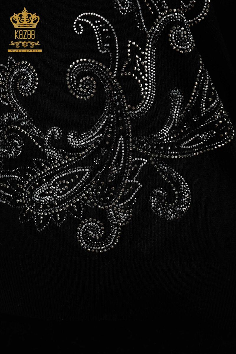 Kadın Triko Taş İşlemeli Dik Yaka Siyah - 30013 | KAZEE