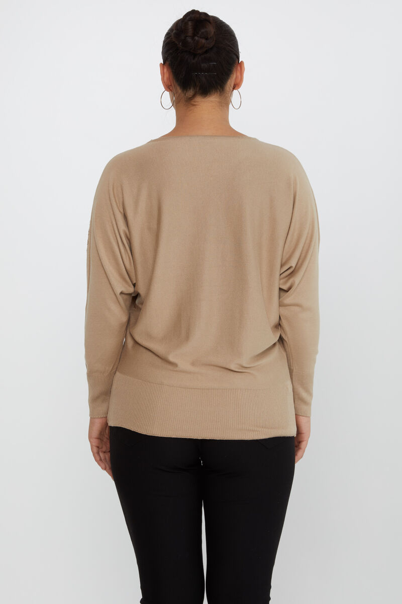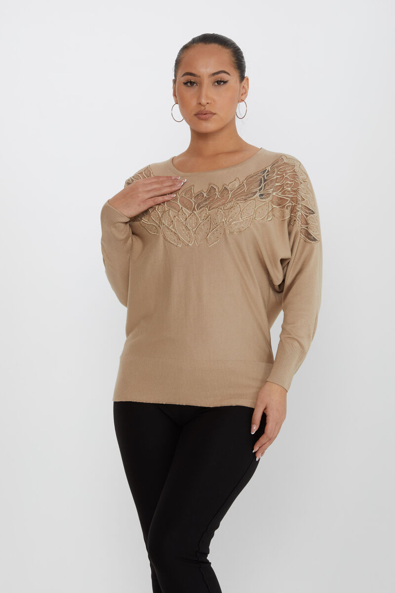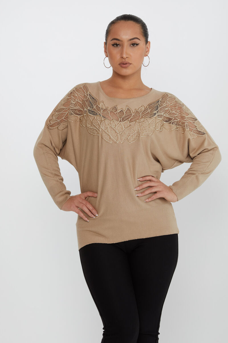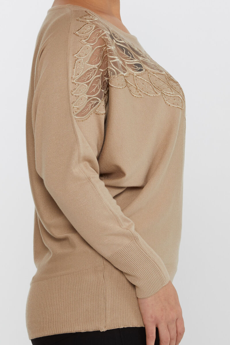 Kadın Triko Taşlı Nakışlı Tül Detay Bej - 16942 | KAZEE