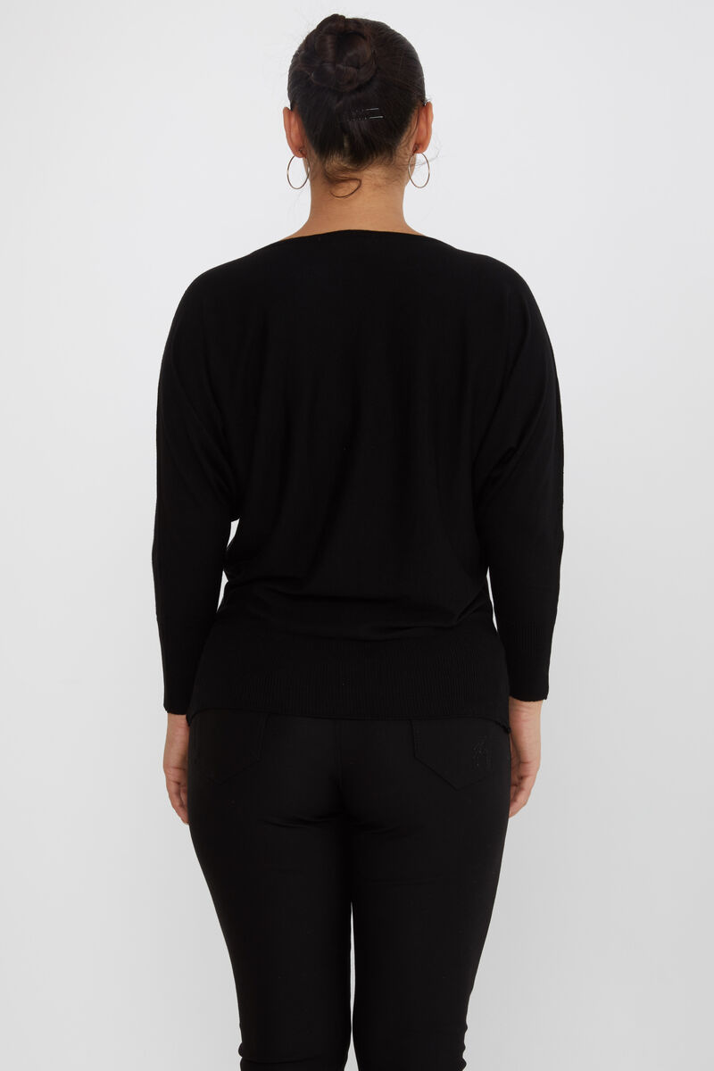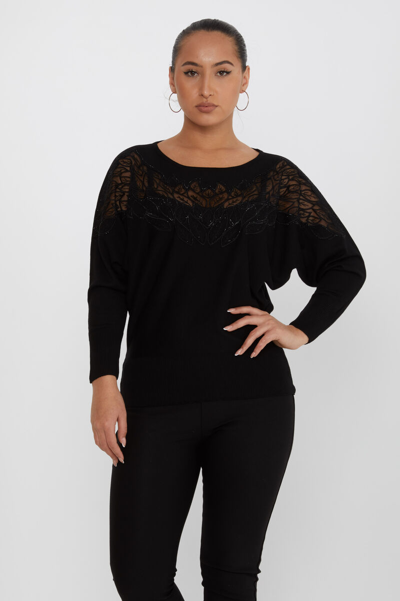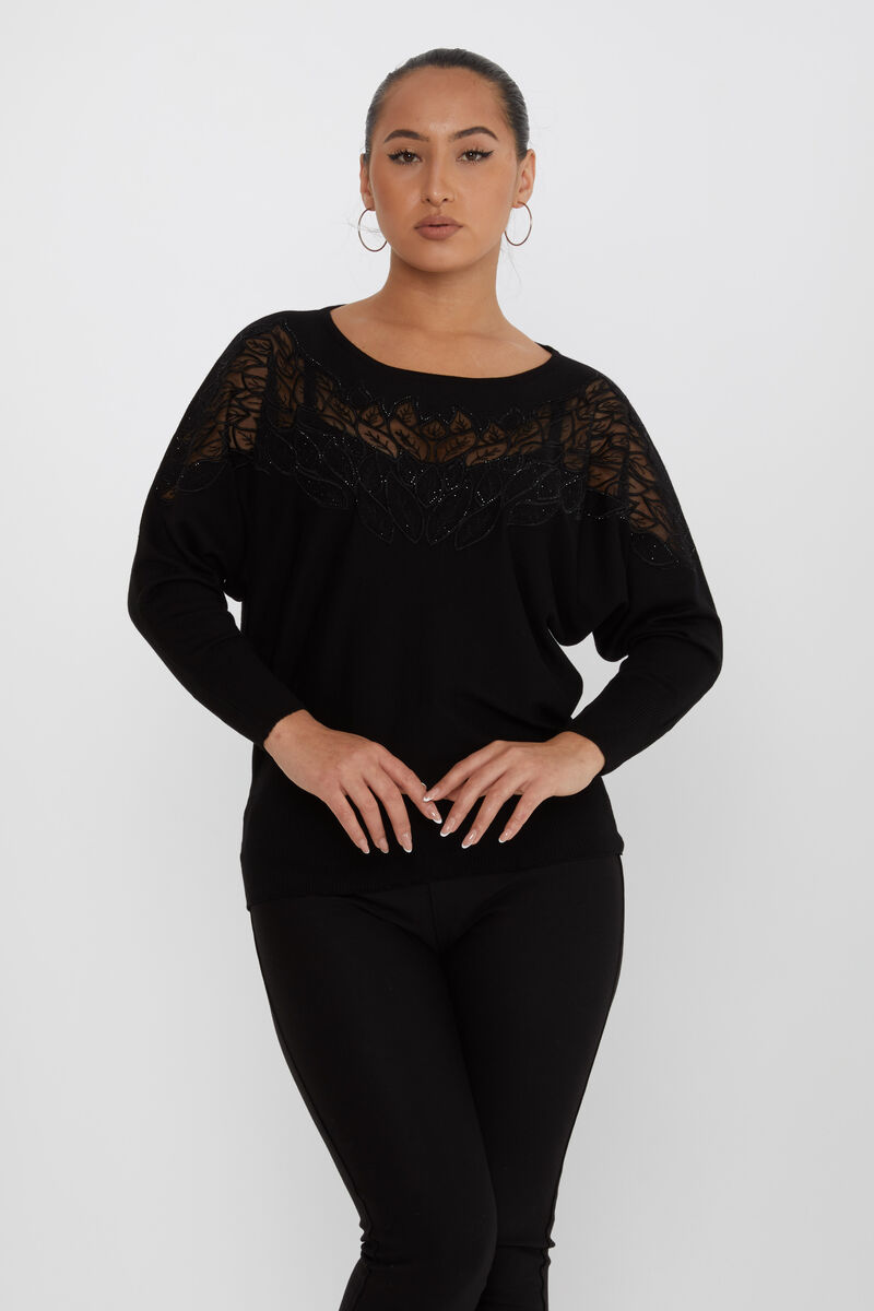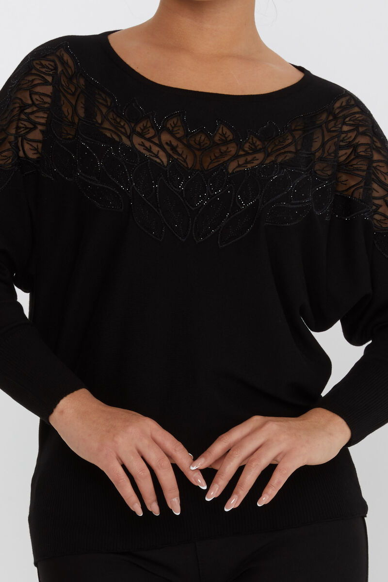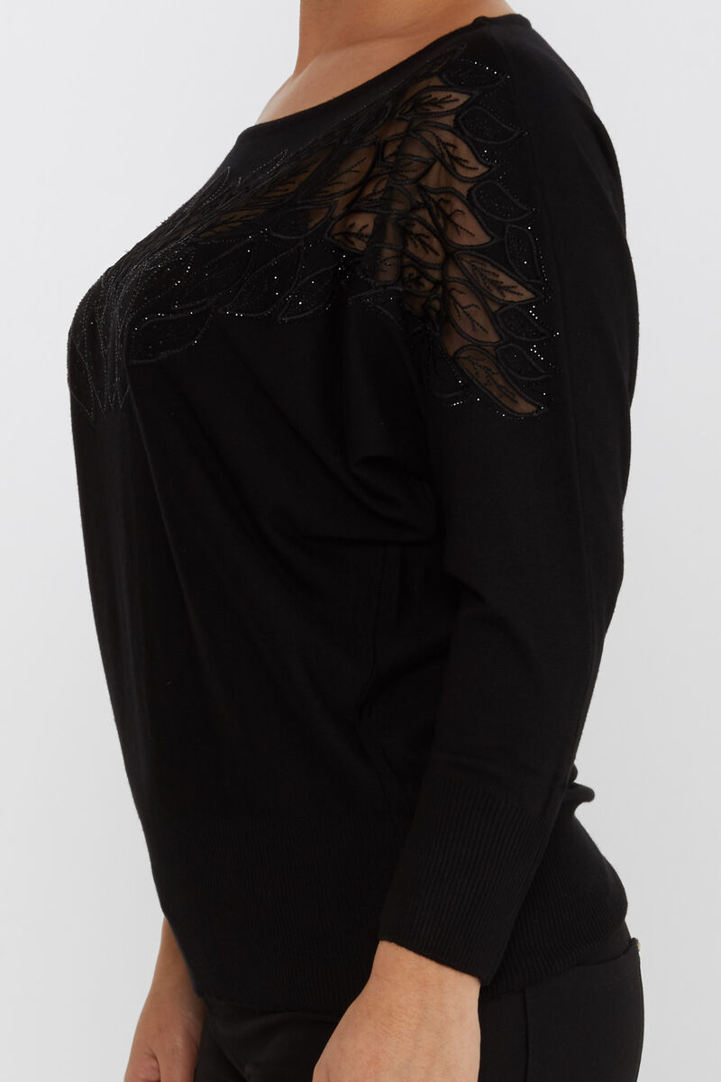 Kadın Triko Taşlı Nakışlı Tül Detay Siyah - 16942 | KAZEE