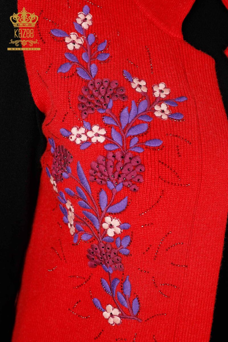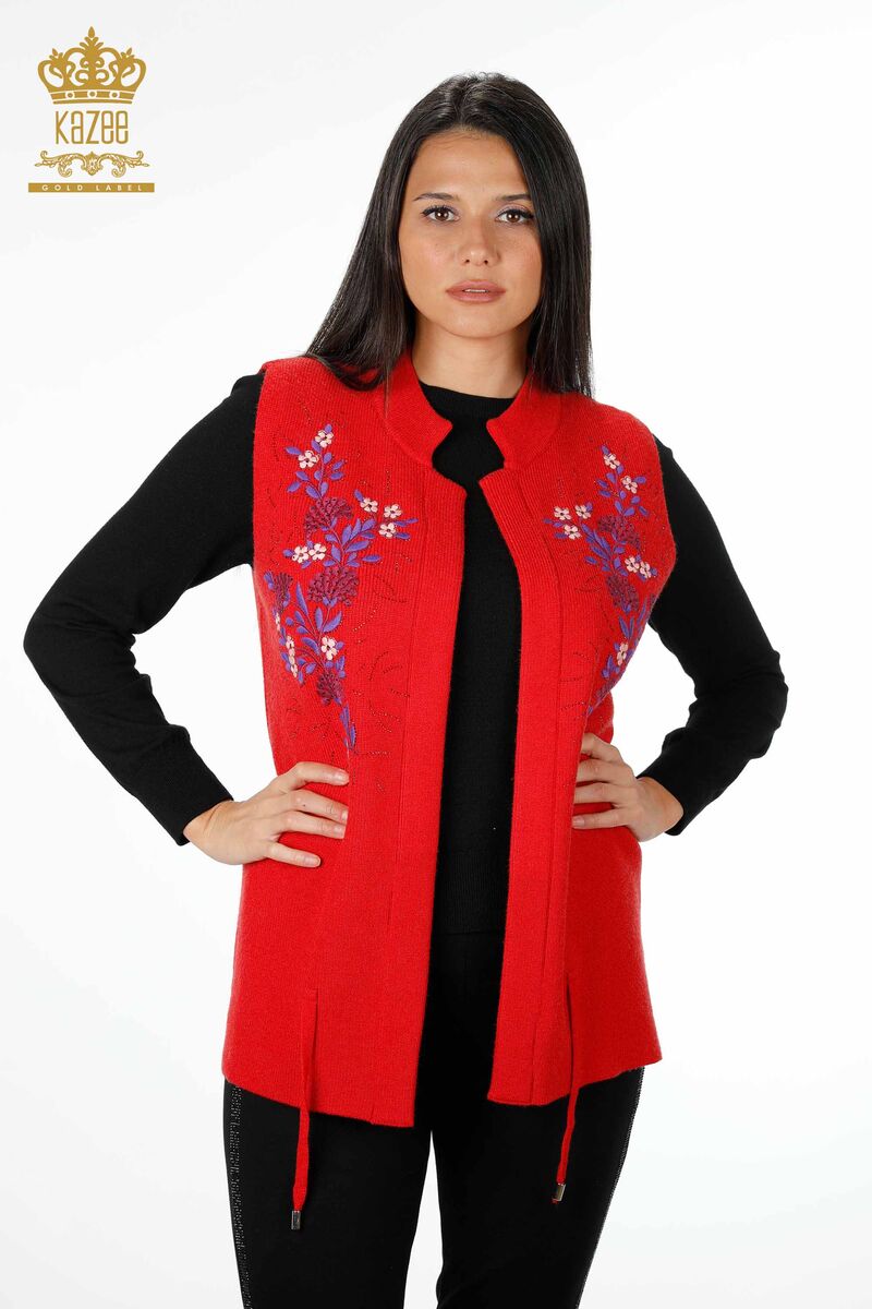 Kadın Yelek Nakış İşlemeli Kristal Taşlı İp Bağlamalı Kırmızı - 16814 | Kazee