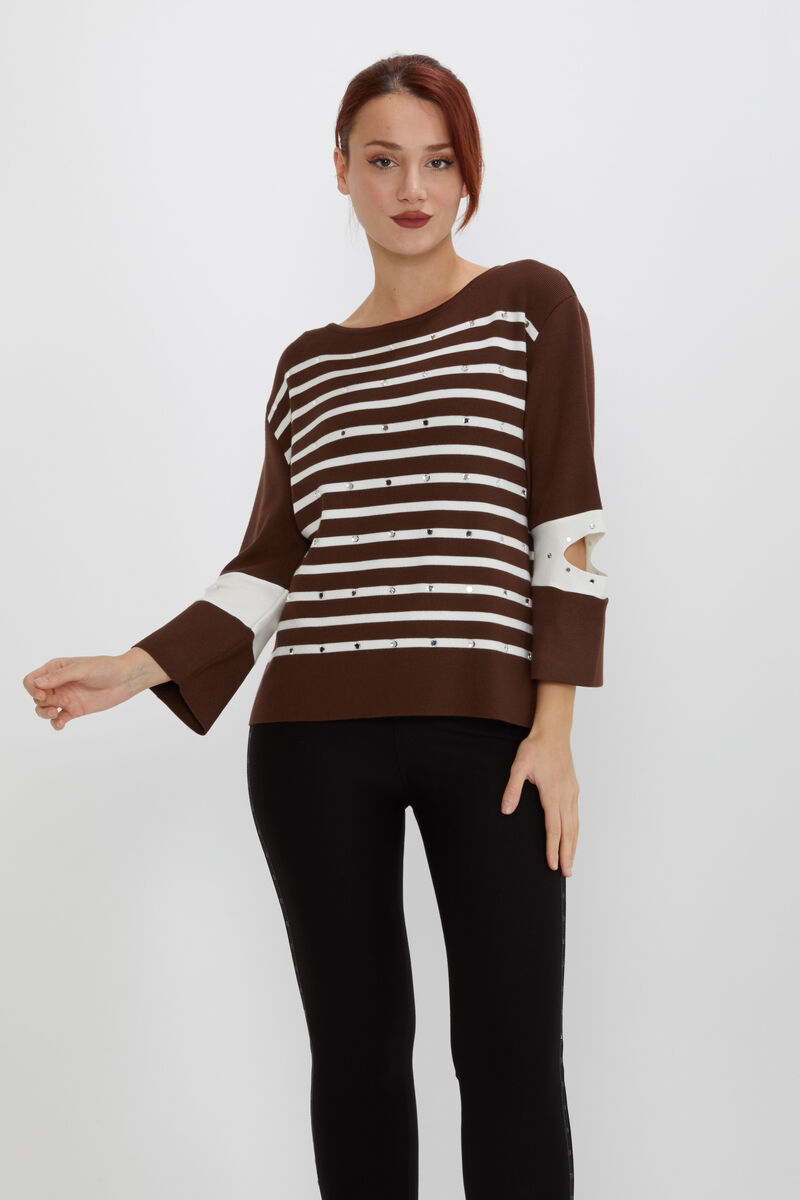 بلوزة نسائية محبوكة مخططة بأكمام مفصلة باللون البني - 31274 | كازي