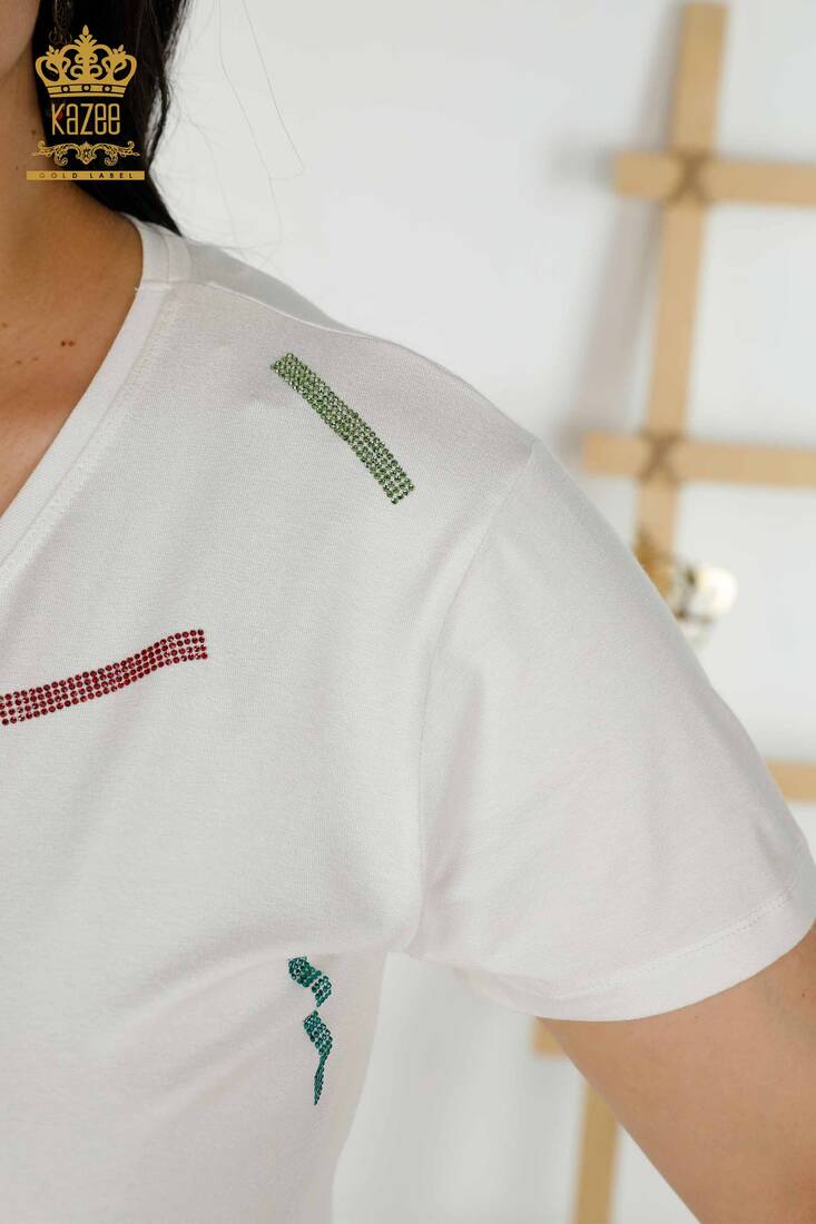 Women's Blouse Colored Stone Embroidered V Neck Ecru - 79365 | KAZEE