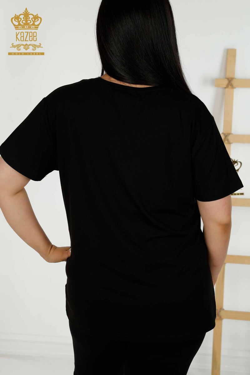 Women's Blouse Short Sleeve Stone Embroidered Crew Neck Black - 79329 | KAZEE