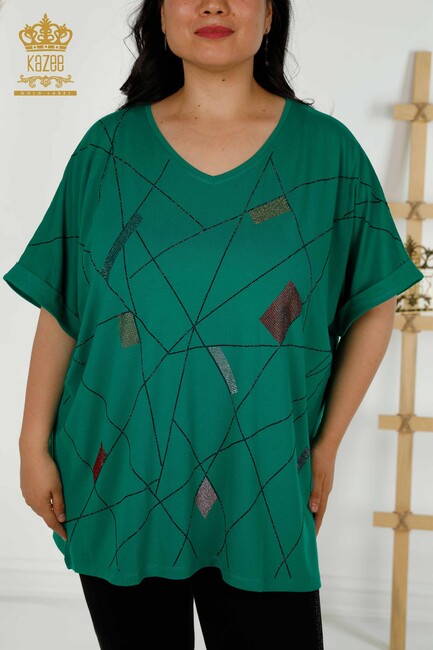 Women's Blouse Stone Embroidered V Neck Green - 79320 | KAZEE