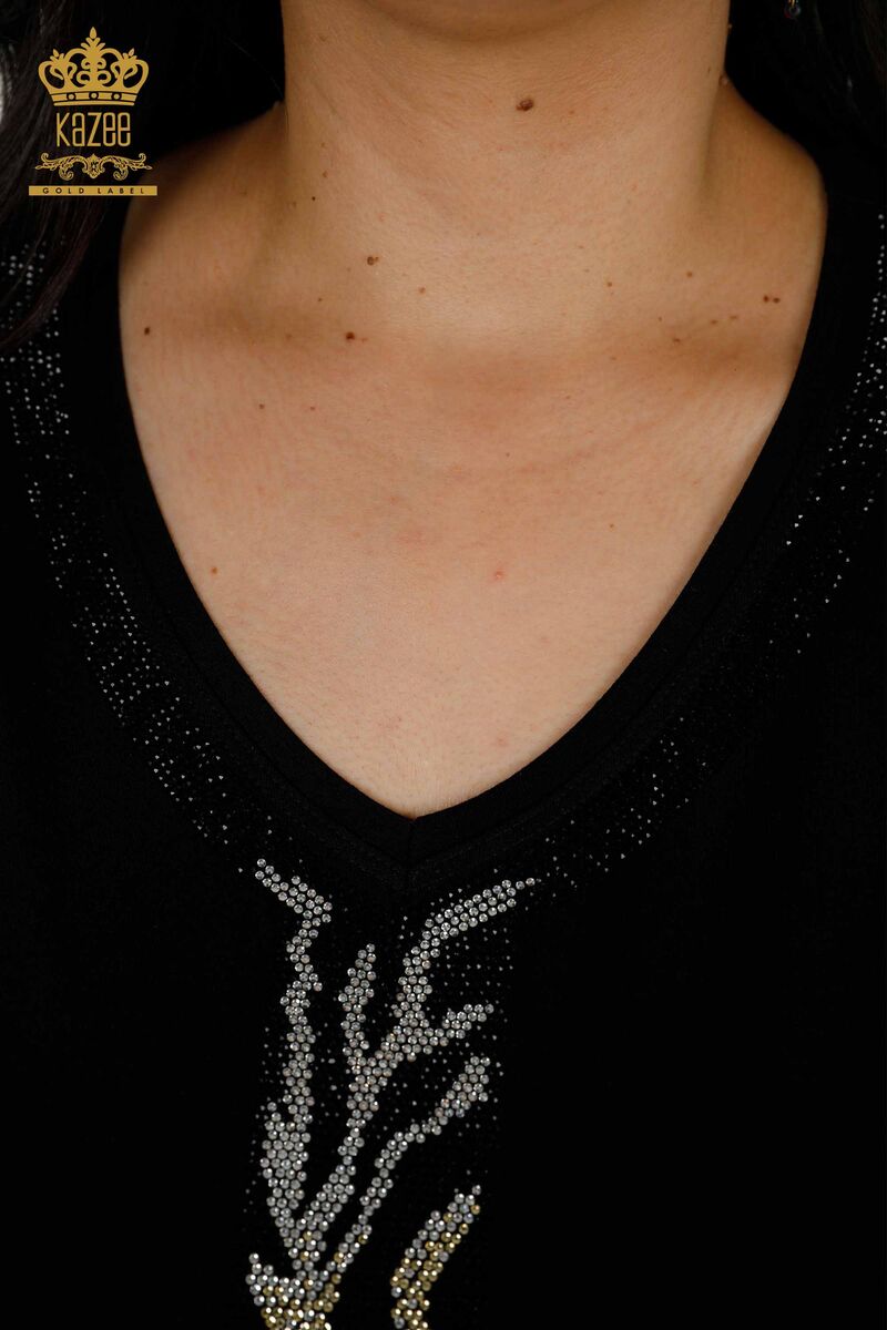 Women's Blouse Sliver Stone Embroidered V Neck Black - 79242 | KAZEE