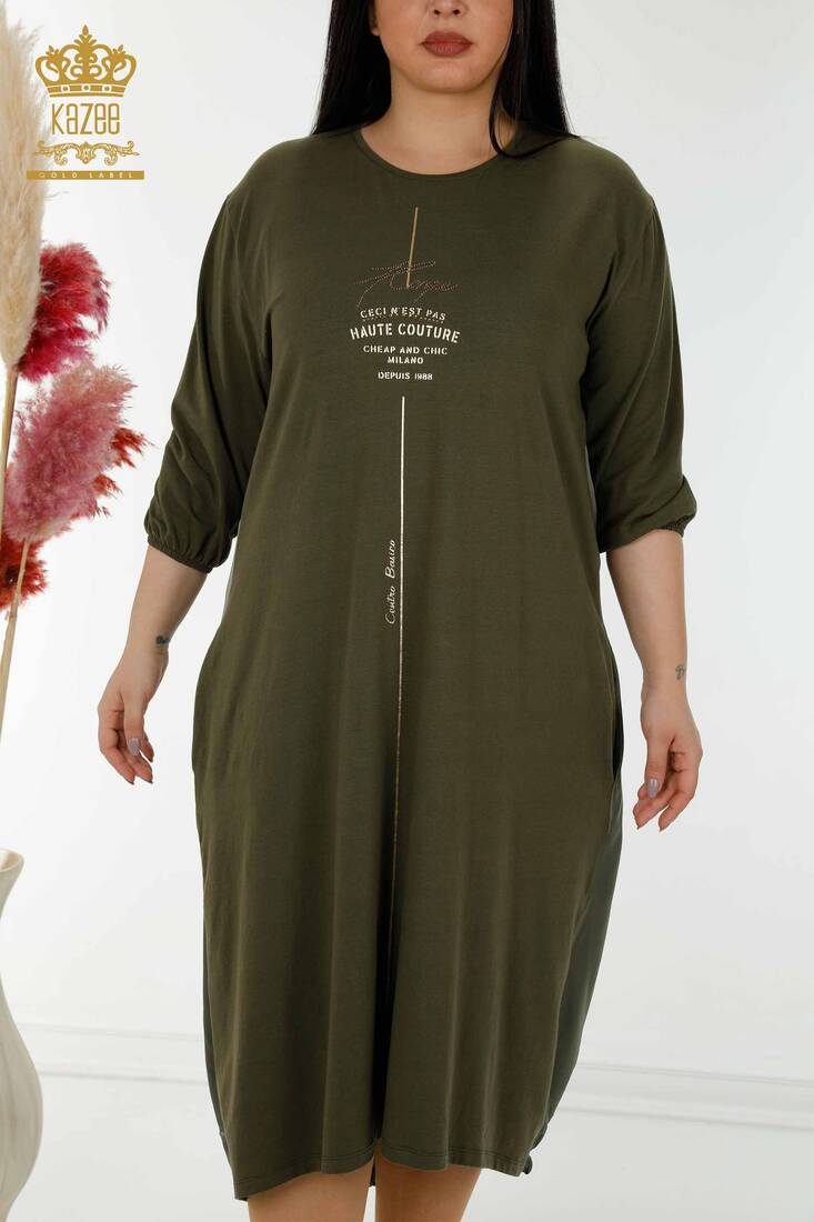 Women's Dress Stone Embroidered Pocket Detailed Crew Neck Khaki - 20331 | KAZEE