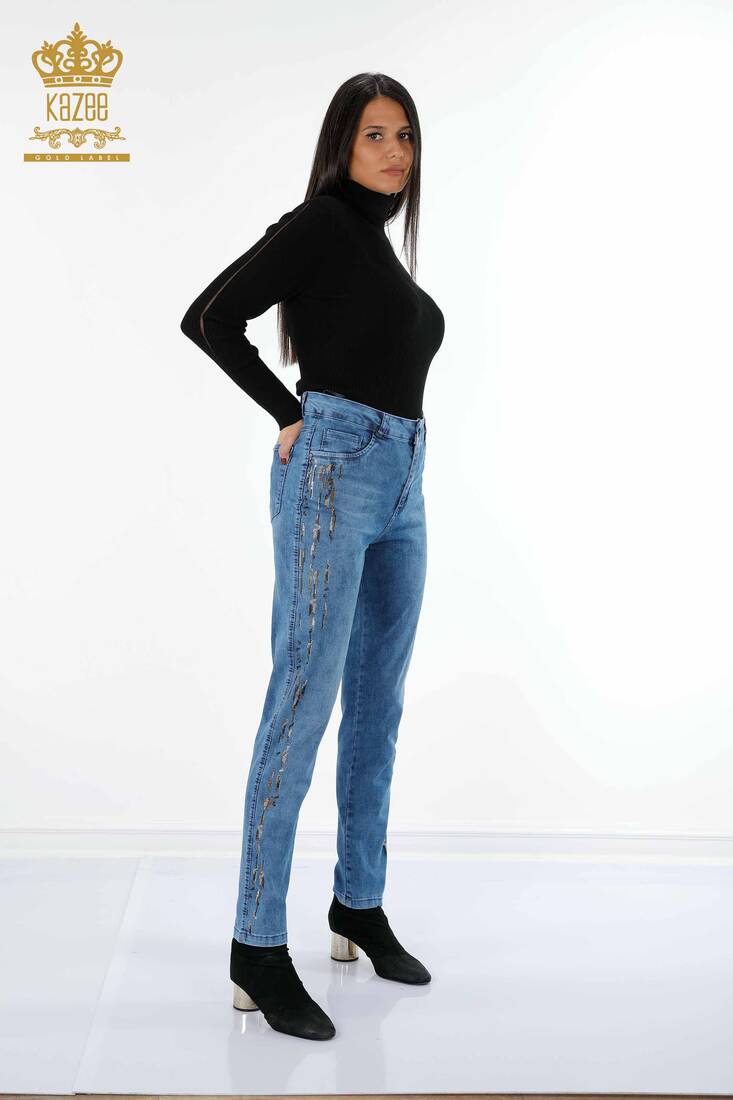 Women's Jeans Striped Stone Embroidered Pocket Blue - 3544 | KAZEE