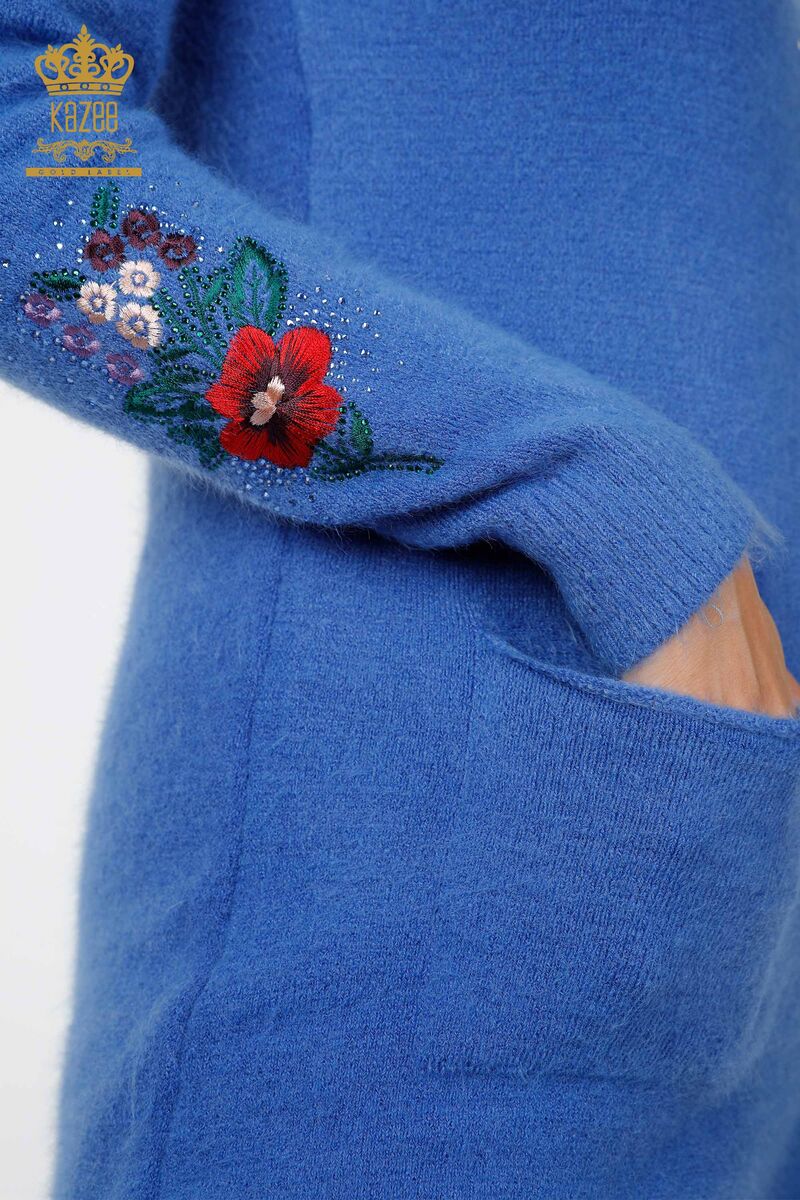 Women's Knitwear Tunic Floral Pattern Stone Embroidered Pocket Turtleneck Blue - 18870 | KAZEE