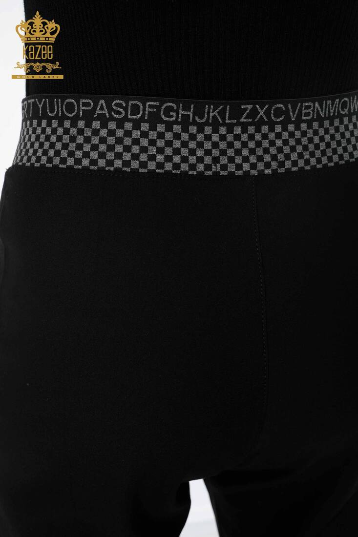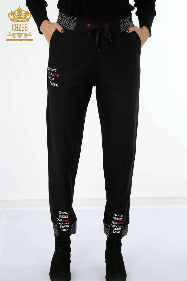 Women's Trousers With Text Detailed Thread Tie Elastic Waist Black - 3643 | KAZEE