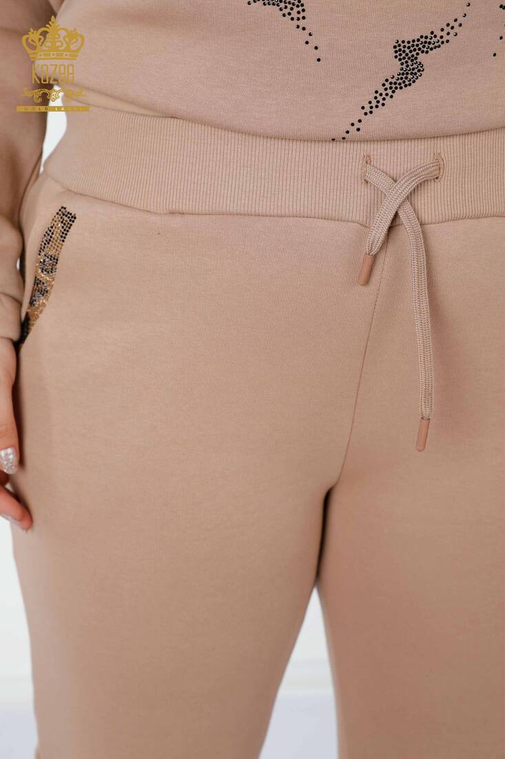 Women's Tracksuit Set Tiger Detail Stone Embroidered Pocket Crew Neck Mink - 17473 | KAZEE