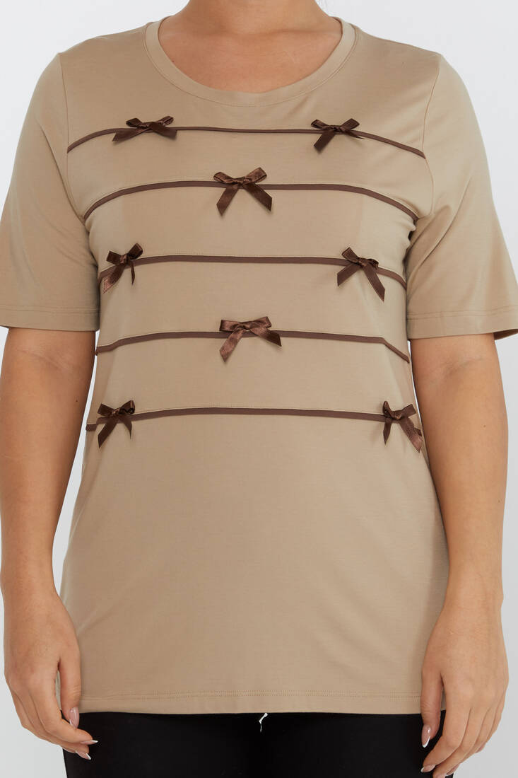 Women's Blouse Ribbon Detail Short Sleeve Beige - 80050 | KAZEE