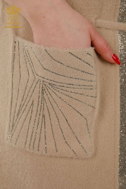 Женский Длинный Жилет с Галстуком Детализированный Бежевый Карман с Вышивкой Камнем - 30244 | КАЗЕЕ