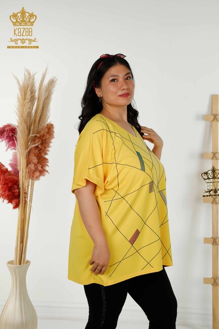 женская блузка с вышивкой камнями и V-образным вырезом желтая - 79320 | КАЗЕЕ