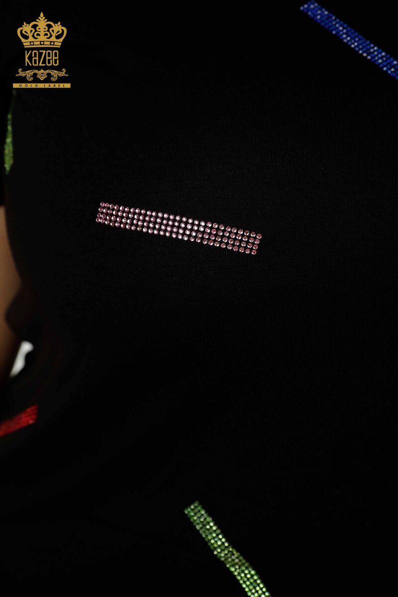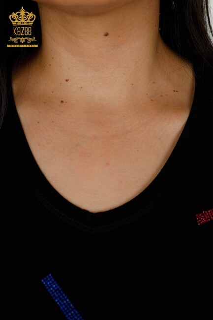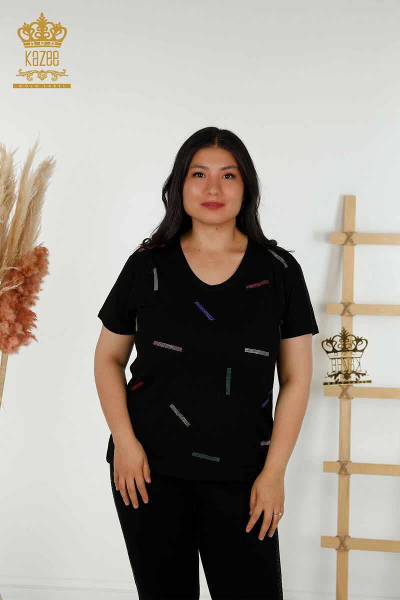 Женская блузка Цветная вышивка камнем с V-образным вырезом Черный - 79365 | КАЗЕЕ